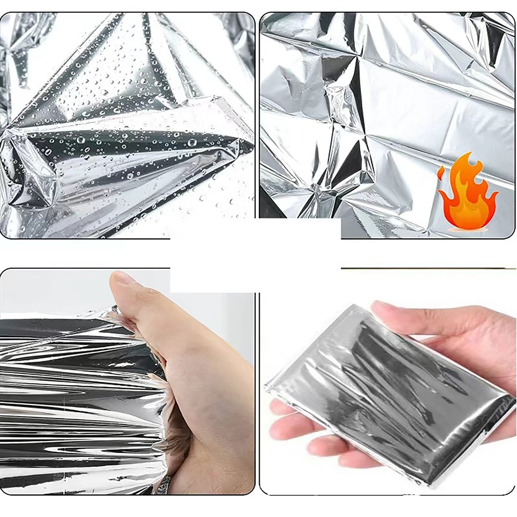 Made of durable insulating material for survival emergency blanket, lightweight, thin, tough, high tear, waterproof and windproof. Emergency reflective blanket. Reflects 90% of radiated body heat to help stay warm in cold weather, and deflect heat from the a shelter to stay cool. Reflective emergency survival space the reflective interior protects you from and keeps you warm reflecting your body heat back to you. Easy to storage and retrieval. Each blanket is individually folded, wrapped, and sealed in half palm of your hand or pocket. 82.68″ L x 51.18″ W