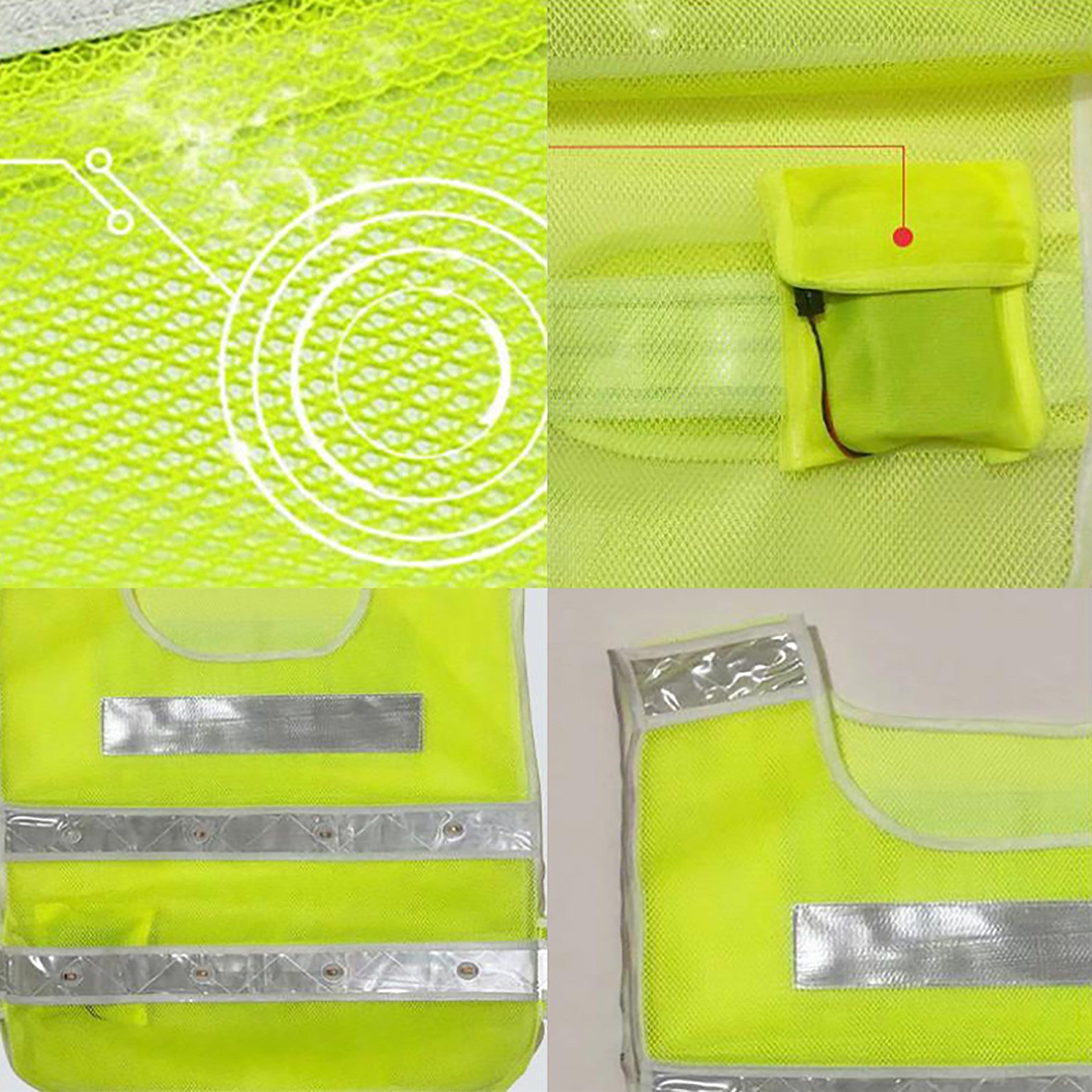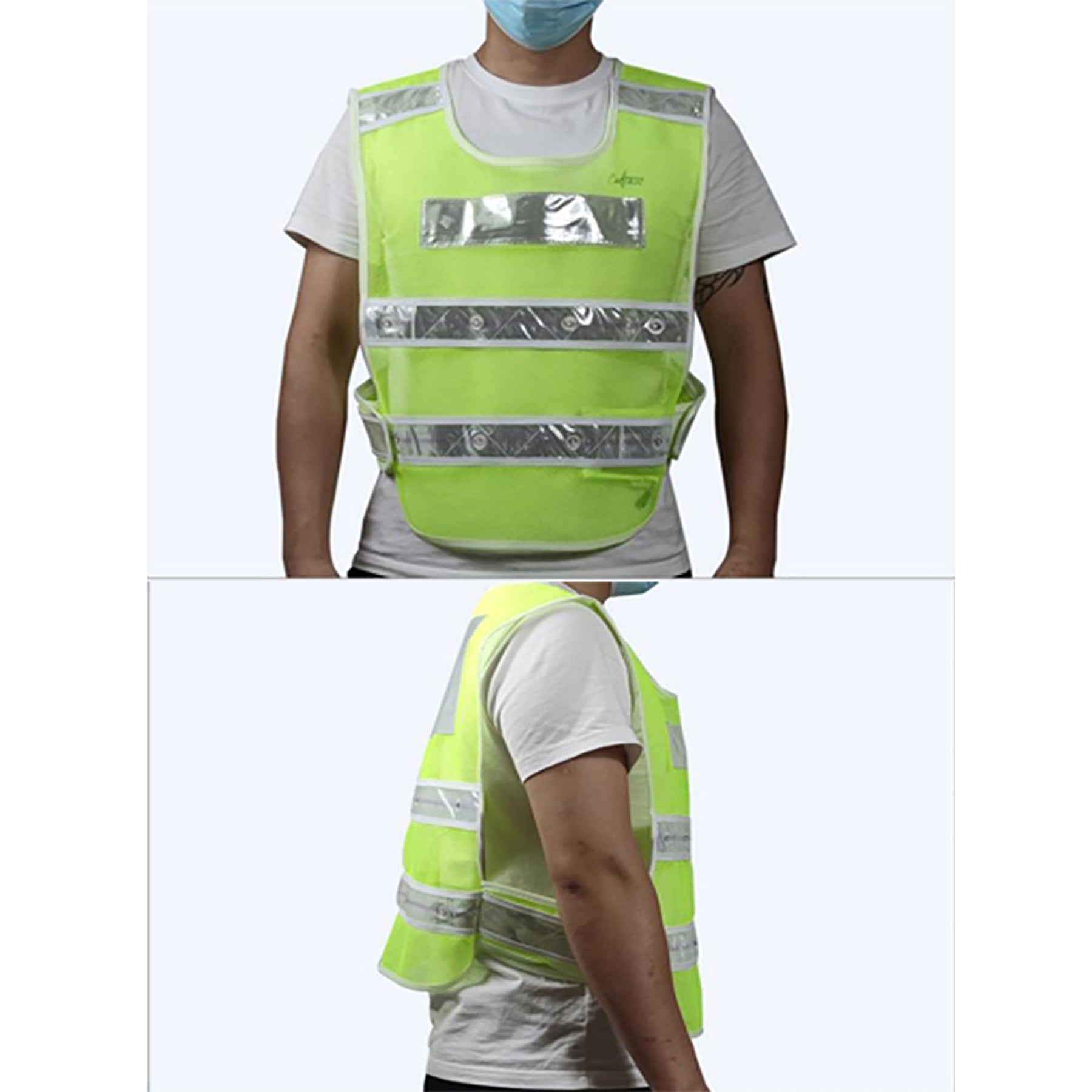 3 different modes of lighting, continuous, slow flashing, or rapid flashing. Broad reflective white stripes with built-in LED lights. Good quality, lightweight lime green fabric safety vest. 20.86″ L x 15.74″ W
