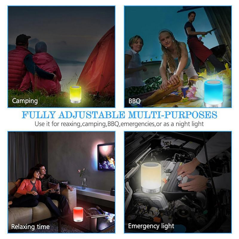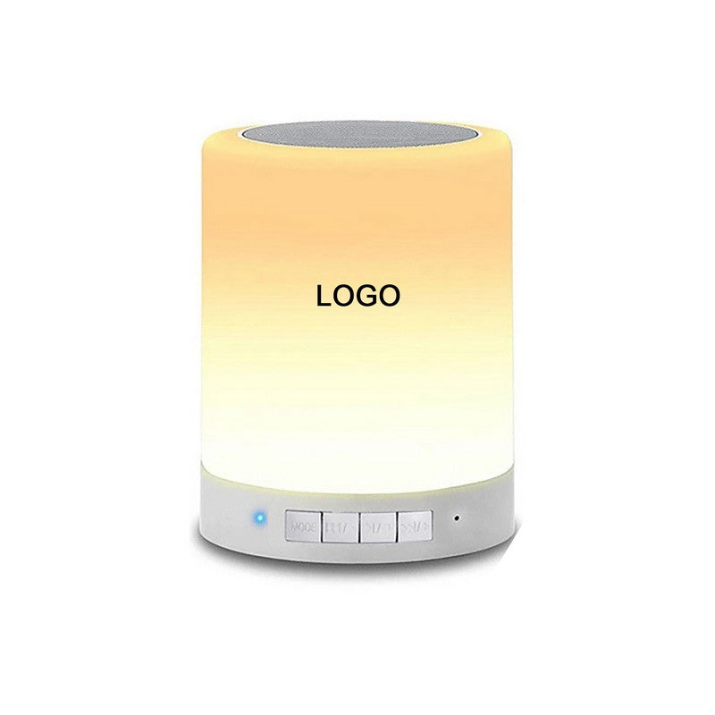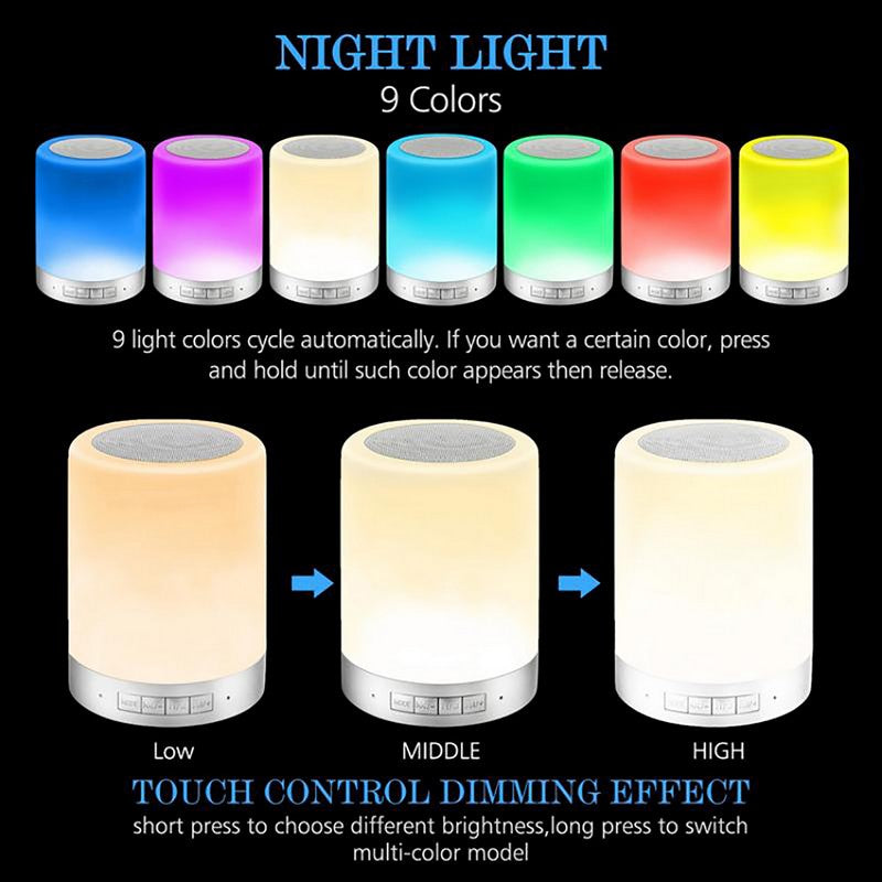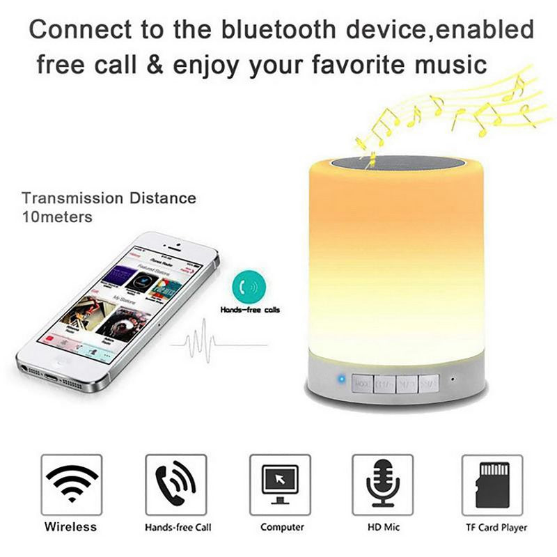 Wireless Bluetooth speaker with touch control LED mood lamp, SD card music player, speakerphone, table lamp, and night light for children. Easily switch between 3 levels of brightness warm light mode and 6 color-changing light modes. LED flashes to the beat of music through Bluetooth. 3.9′ L x 3.9′ W x 4.72′ H