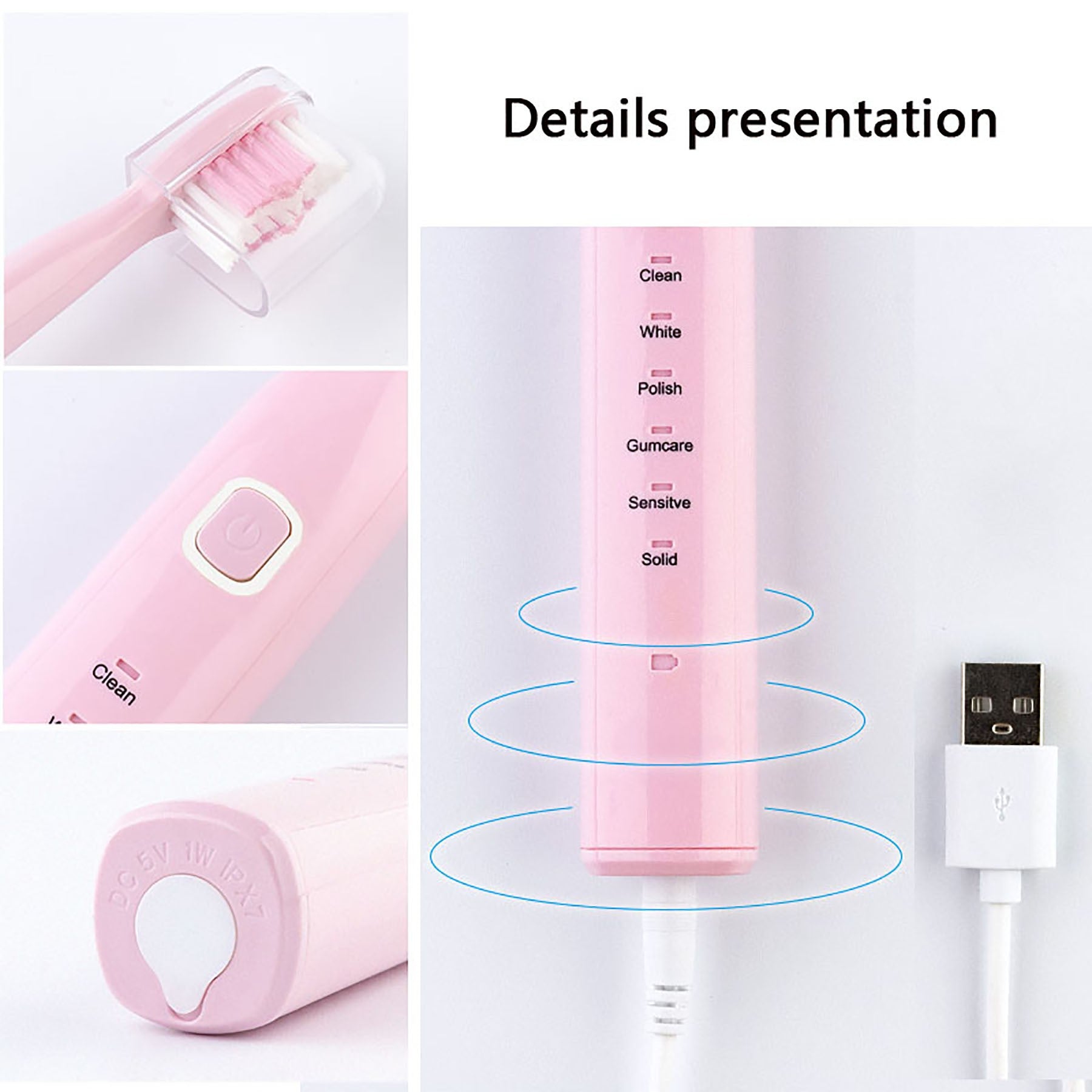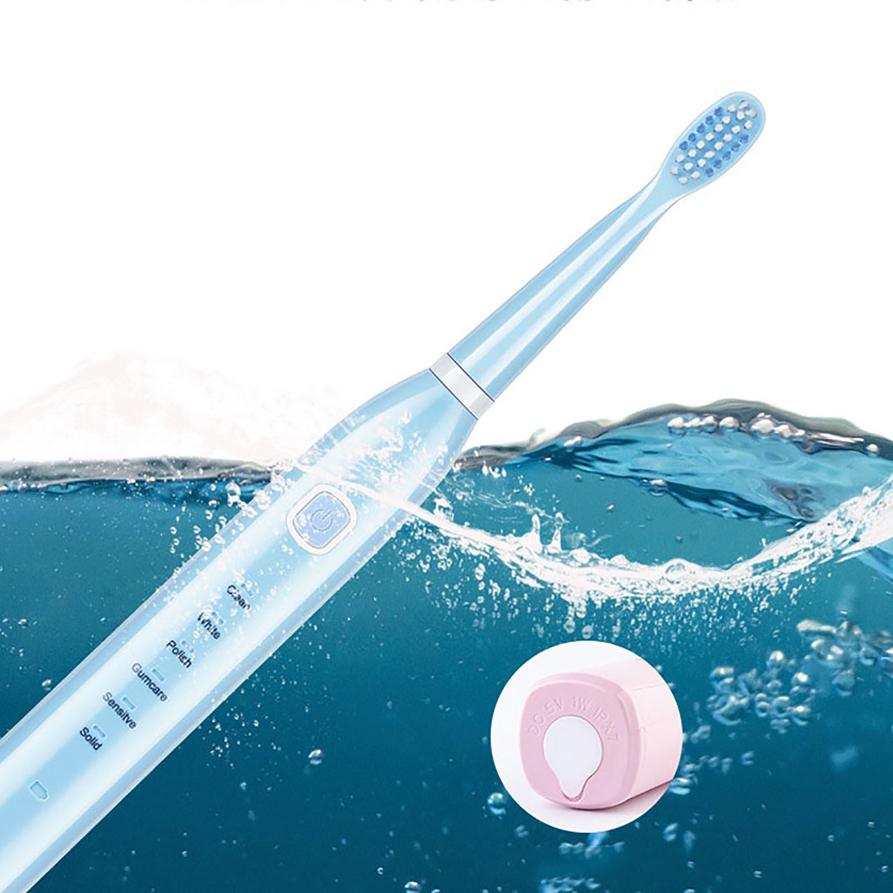 New upgraded electric toothbrush with the latest sonic technology along the gum line for exceptional cleaning and removal of plaque, whitening your teeth and improving your oral health in two weeks better than a manual toothbrush. High performance brushing modes, Clean gentle, White strong, Polish strong invert frequency, Mild gentle invert frequency and Sensitive soft to suit different conditions of teeth and gums, so you can choose different modes according to your preferences and dentist’s recommendations. Shape design to suit tooth topography for thorough cleaning of gums and hard-to-reach areas. Safer than a USB charger. 8.98′ L x 1.1′ W x 1.1′ H