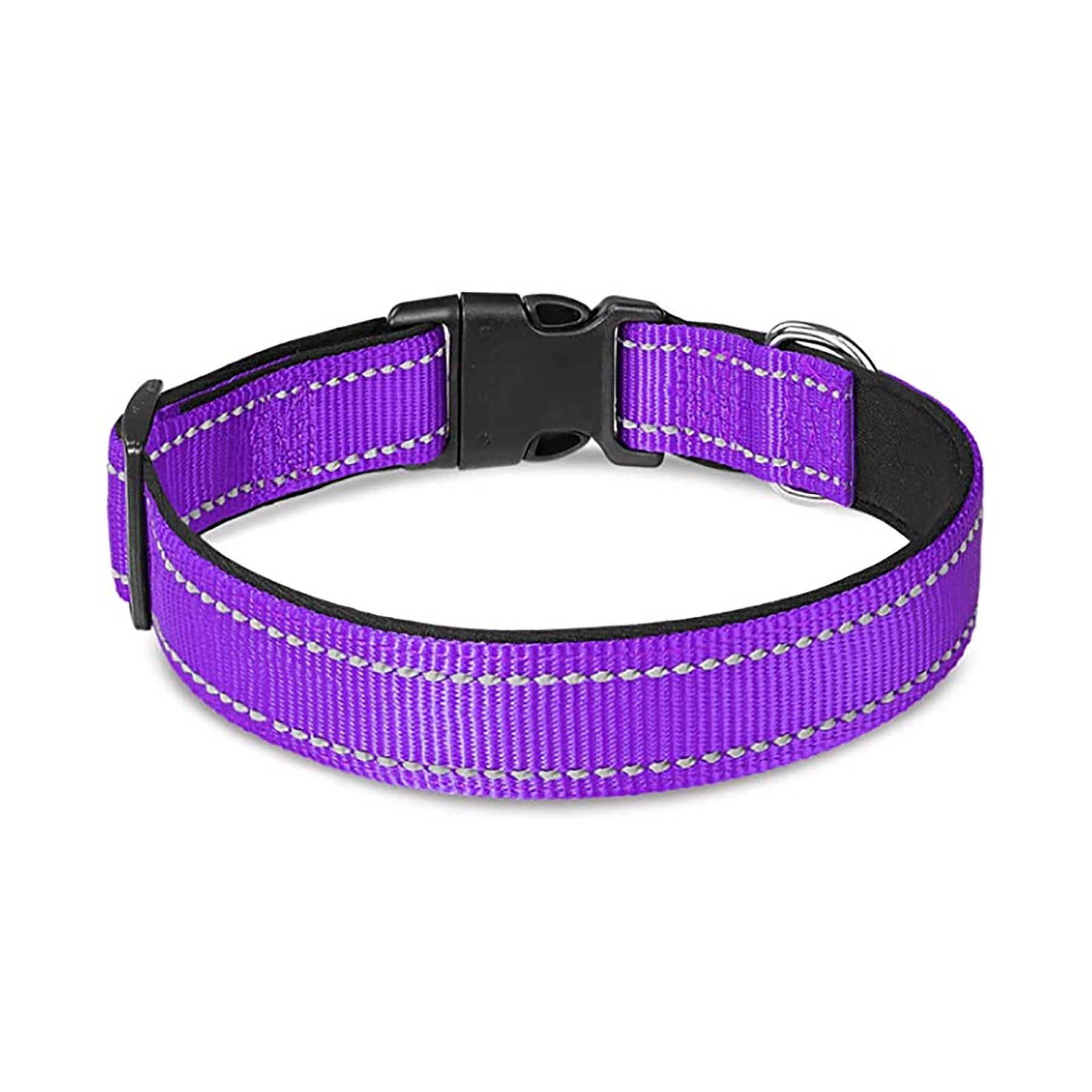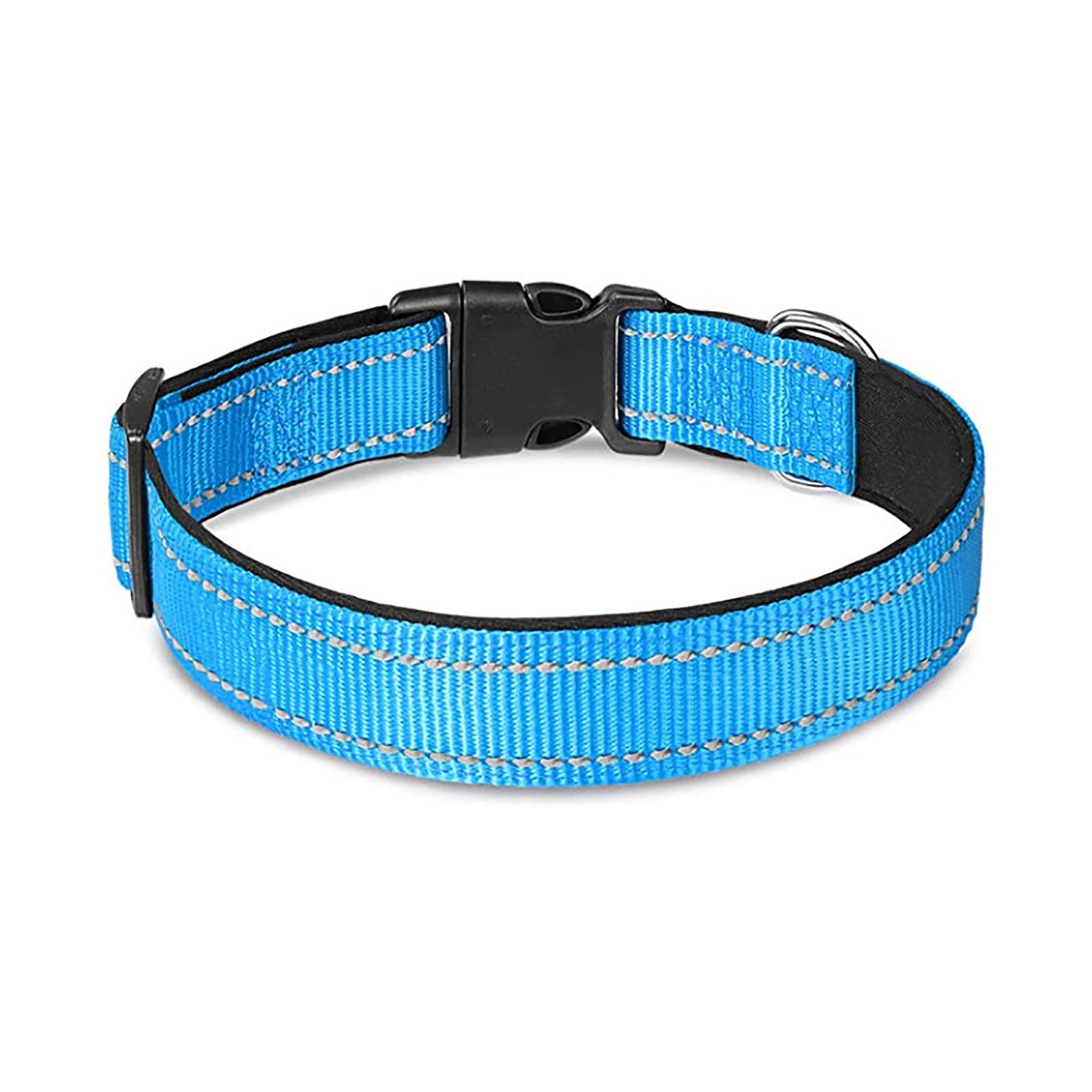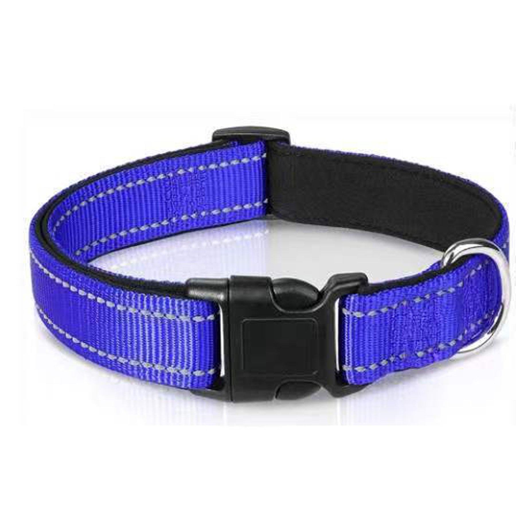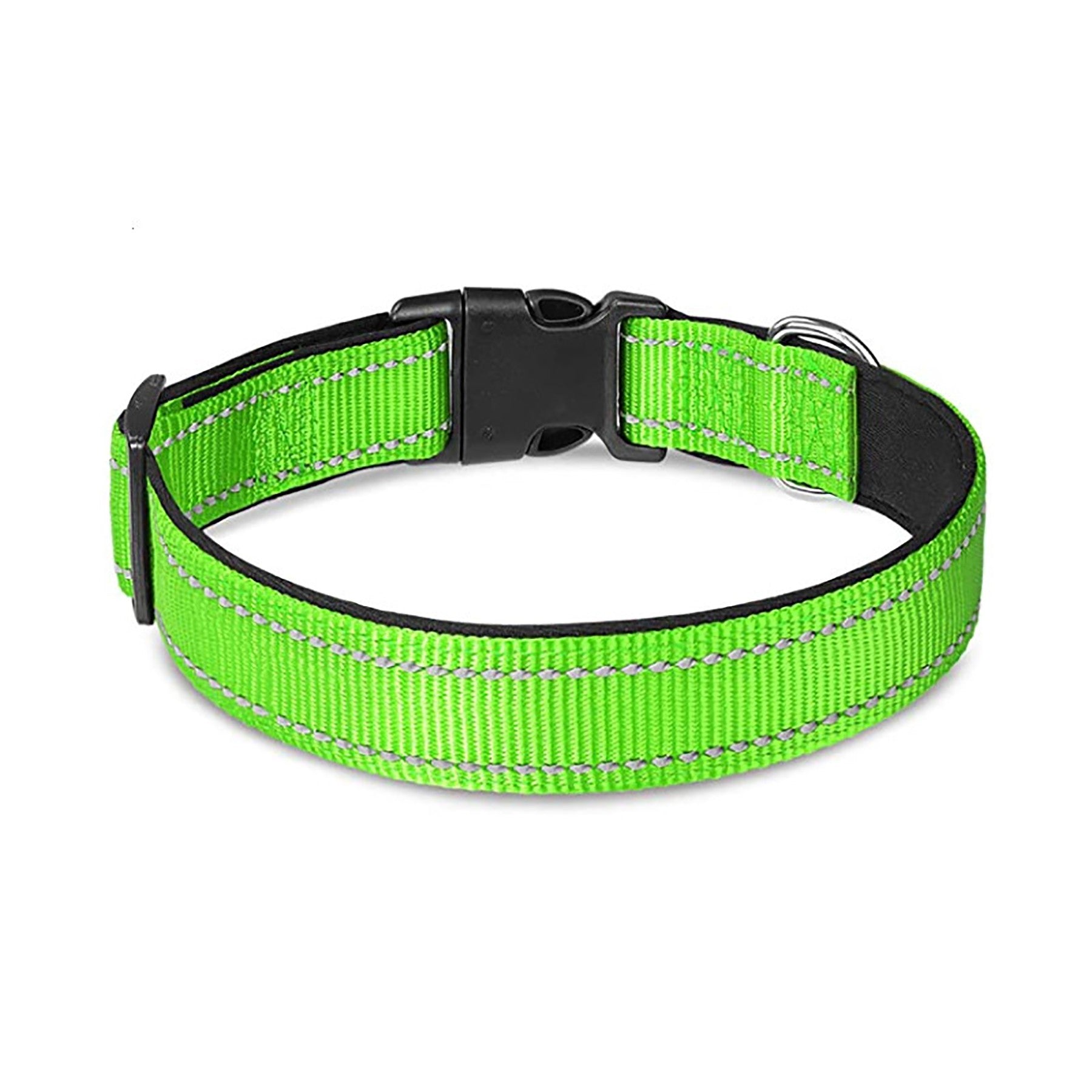 The dog collar is made of durable nylon with padded neoprene rubber for comfort. It dries quickly, is flexible, and ultra-soft. A separate loop allows for easy attachment of tags and leashes. Highly reflective threads ensure visibility at night. Quick-release plastic buckle for easy adjustment and comfort. 1″ L