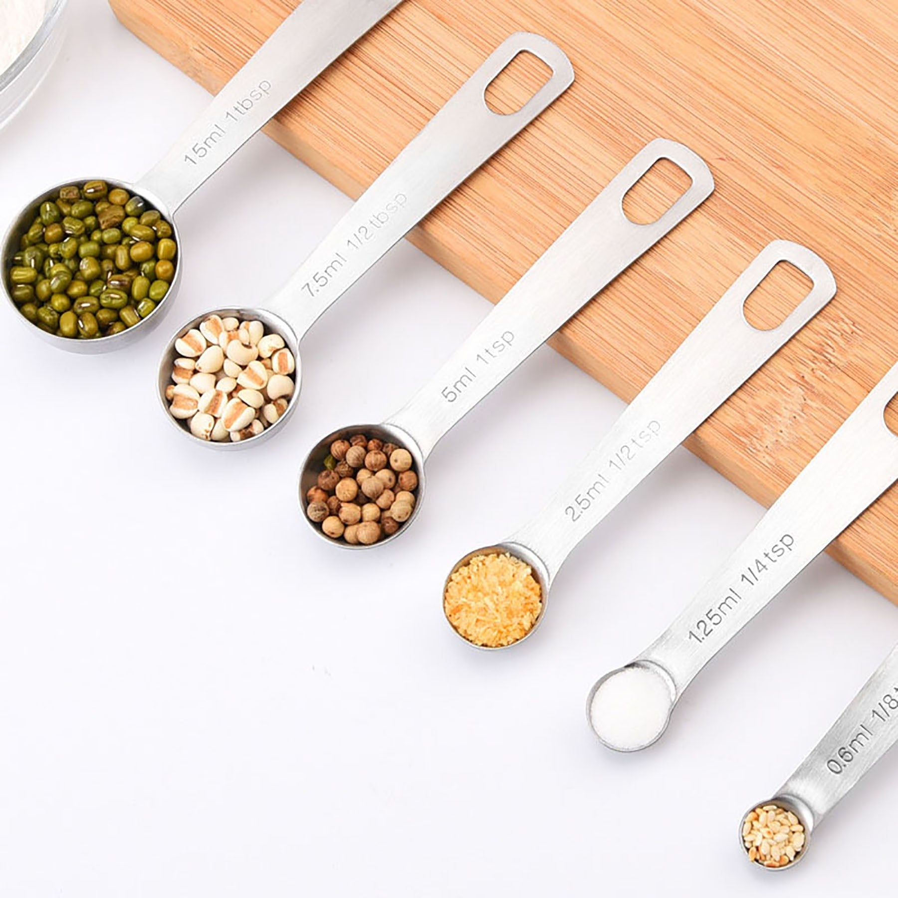 Introducing the Precision Measuring Spoon Set – a must-have kitchen gadget for new apartments. This set contains six stainless steel double-ended spoons with a leveler, perfect for accurately measuring spices and seasonings. The variety of sizes makes it versatile for different containers. The round tip design is great for liquid ingredients, replacing traditional measuring cups. Practical and stylish, this set is essential for precise cooking. 1.18″ L x 5.79″ W