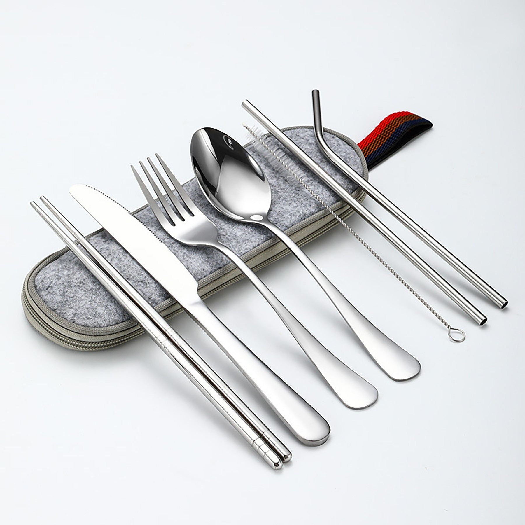 Introducing our premium cutlery set made from high-quality 304 stainless steel, resistant to rust and corrosion. Set contains Dinner Fork, Tablespoon, Knife, Chopsticks, Cleaning Brush, Straight Straw, Bent Straw, Carrying Case, and Pouch. Perfect for home, offices, restaurants, hotels, and outdoor activities. Upgrade your dining experience with our eco-friendly set today! 10.03″ L x 2.95″ W x 1.2″ H