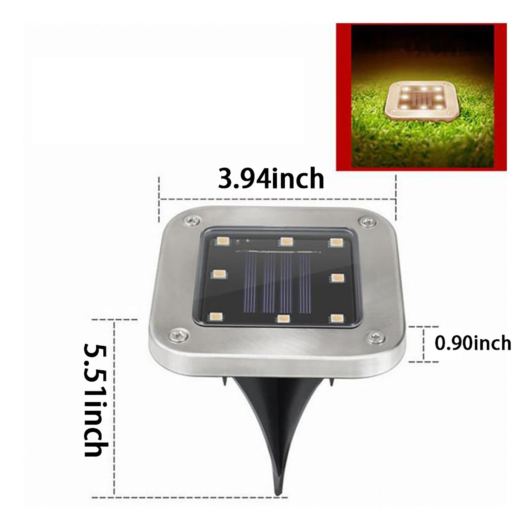 Solar-powered LED bulbs can accumulate and store clean energy during the day and provide more than 10 hours of lighting power at night. Connect the attached wooden stakes and install the disk light on the ground. Click the switch button at the bottom of the product to turn off the disk light manually. The moisture-proof design ensures that Disk Lights remain unaffected even after heavy rain. Our products do not use electricity, in addition to safety and cost-effectiveness. The structure is durable and can be used for a long time. The metal shell is rust-proof, portable, and durable. Custom logo available. 4″ L x 5 1/2″ W