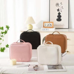 Made from PU leather with a nylon lining and stain-resistant finish. Customizable dividers help organize your cosmetics efficiently. Lightweight and durable with spill-proof interior. a full screen mirror for on-the-go touch-ups. 10.24′ L x 9.06′ W x 3.54′ H