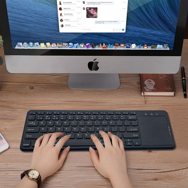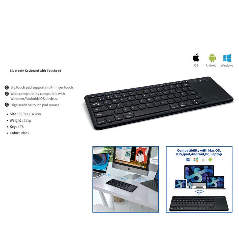 Introducing the Thin Touchpad 2.4G Wireless Keyboard, with 78 keys and a touchpad for easy navigation. It has a stable connection, simple installation, and requires 2 AAA batteries (not included). Upgrade your computer setup with this sleek and stylish keyboard. 14 1/2′ L x 4 1/2′ W