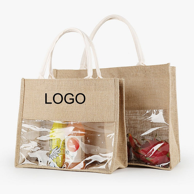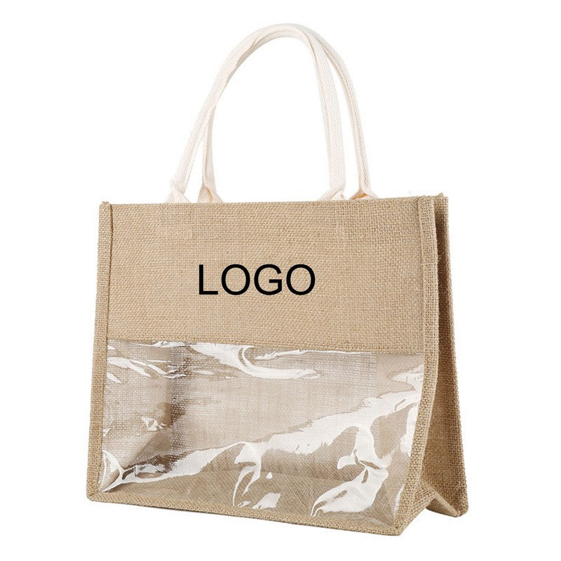 This tote bag is made from jute fabric, it is durable, and has its own unique . This is lined with PVC film composite, waterproof and more convenient to use. The design of transparent PVC embedded in the bag allows more people to see that customers are buying your high-quality products when they buy your products. 18′ L x 5.75′ W x 13.75′ H