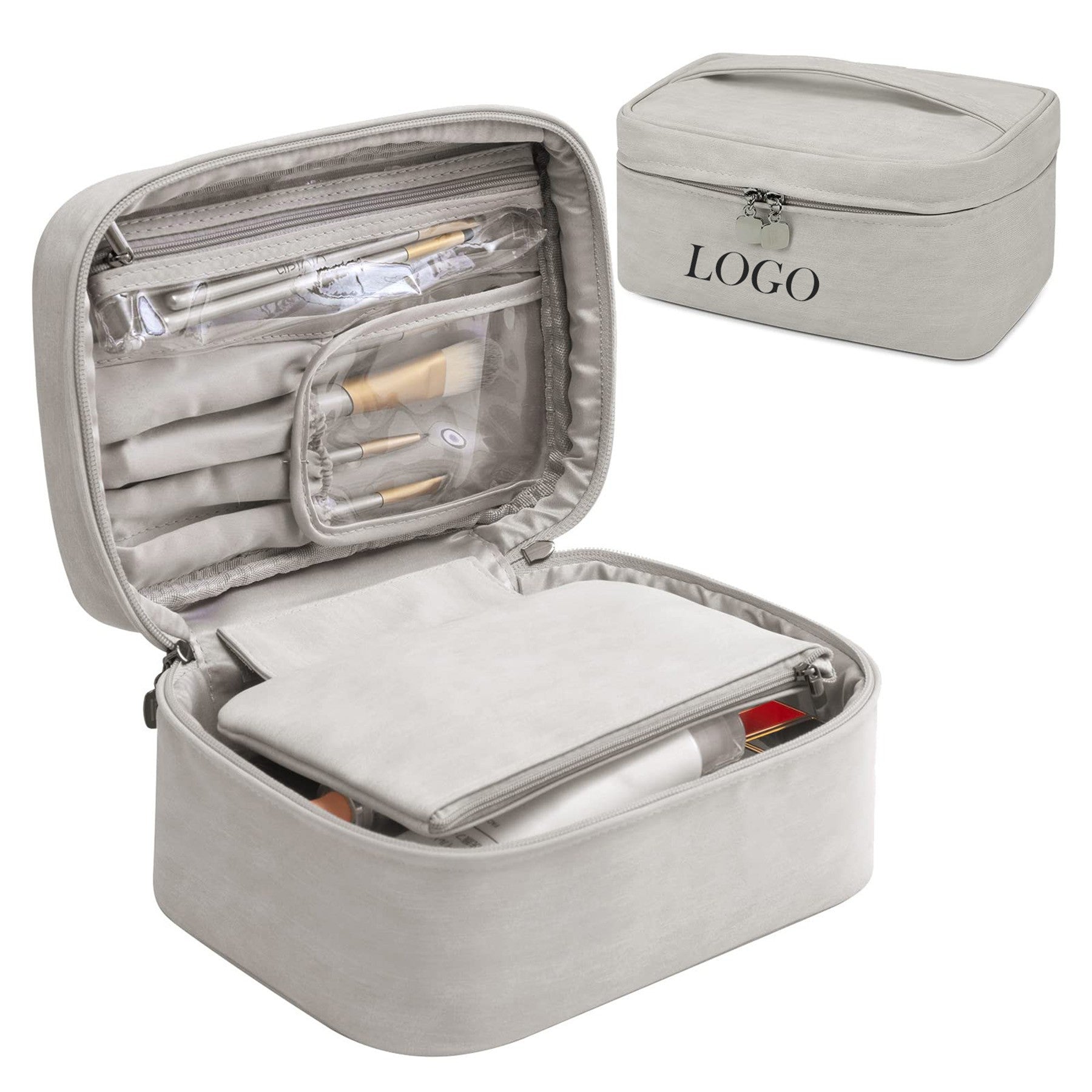 Made from PU leather with a nylon lining and stain-resistant finish. Customizable dividers help organize your cosmetics efficiently. Lightweight and durable with spill-proof interior. a full screen mirror for on-the-go touch-ups. 10.24′ L x 9.06′ W x 3.54′ H