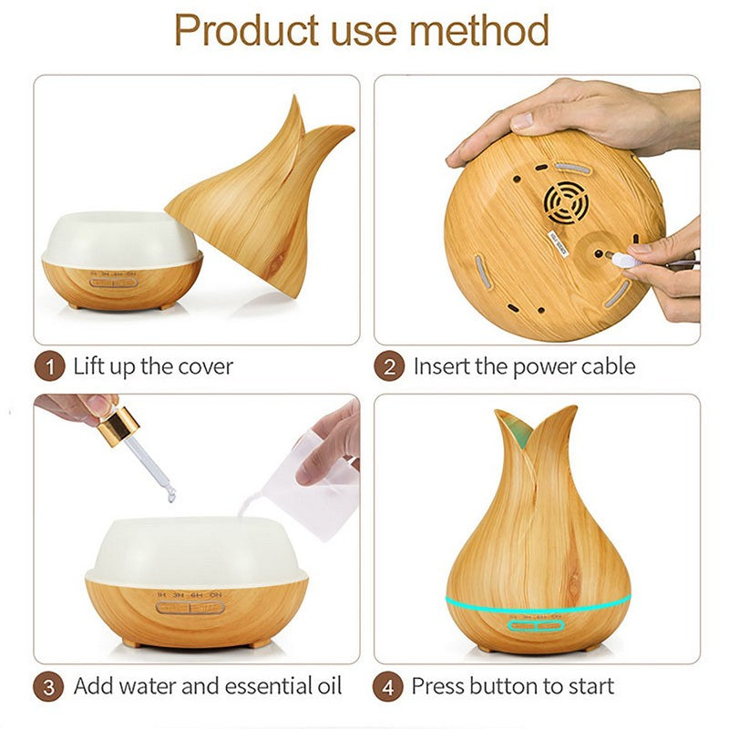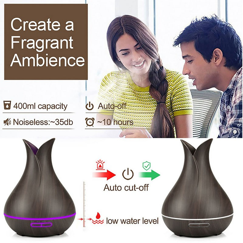 Improve your space with our Ultrasonic Essential Oil Diffuser. It provides soothing scents and adds humidity using advanced technology to create a fine mist. The 400 ml tank runs for up to 10 hours, covering up to 40 square meters. It features seven LED light colors to match your mood. Safe and energy-efficient, it’s easy to use with tap or distilled water. The diffuser comes with a power adapter and water cup, all nicely packaged for gifting. Enjoy the calming effects of our diffuser and boost your wellness! 9.44′ L x 6.61′ W