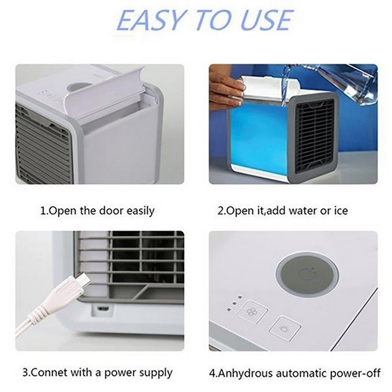 Introducing the 3-in-1 Air Conditioner Humidifier Cooling Fan! This unit combines refrigeration, humidification, and air purification in one. With 3 wind speeds and LED lights, customize your cooling experience. Enjoy quiet operation, eco-friendliness, and up to 8 hours of cooling. Perfect for any room. Upgrade your comfort and air quality today! 6.88′ L x 6.88′ W x 7.28′ H