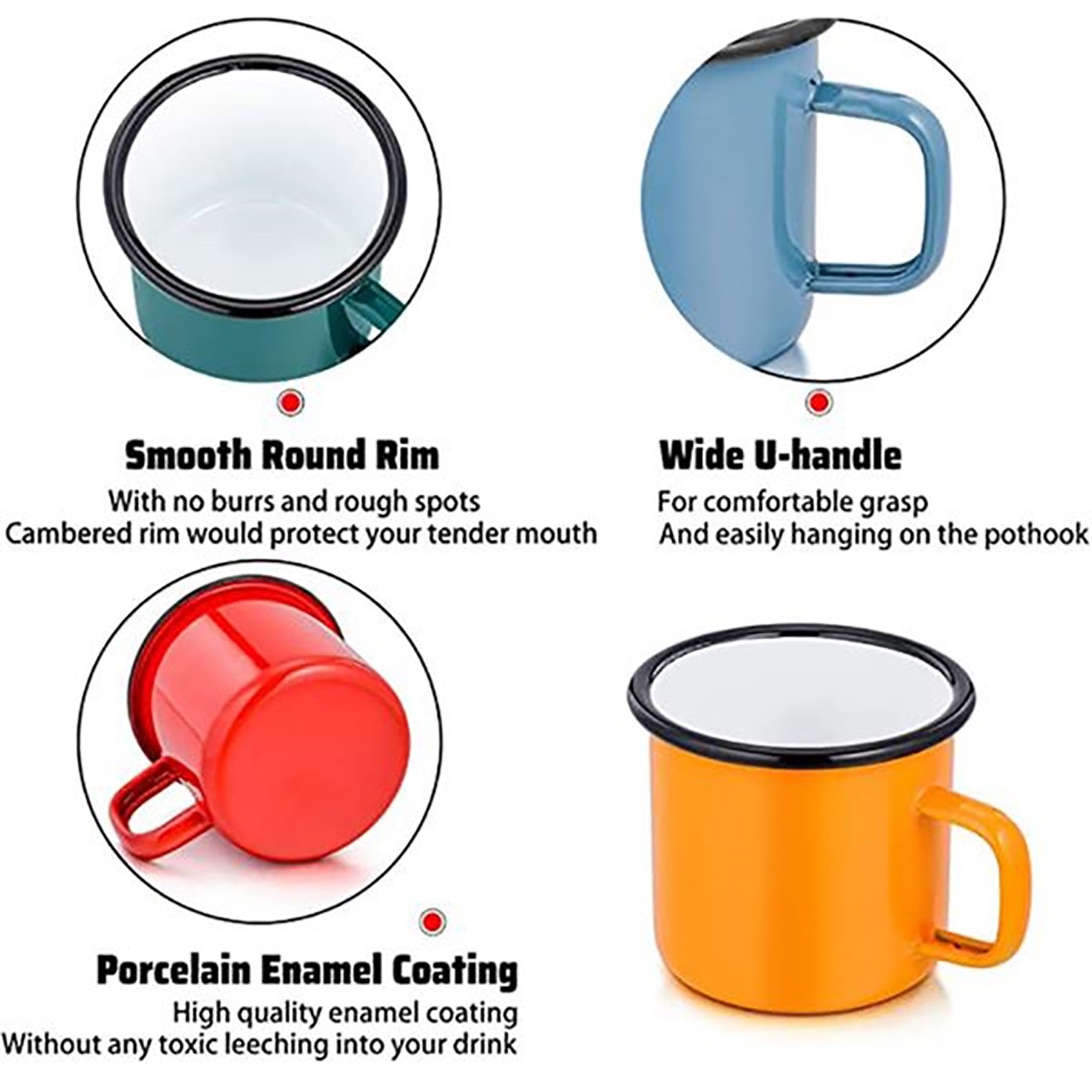 Check out our 12oz Coffee Camp Small Enamel Tea Cups – portable, durable, and made of high-quality steel with rust-resistant enamel coating. Stronger than ceramic and glass, with a rolled black rim and wide U-handle for comfort. Perfect for any drink with a 12oz capacity. Easy to clean with soft detergent, hand wash recommended. Choose our Enamel Camping Mugs for a stylish and durable daily beverage option. 3.43″ L x 3.15″ W