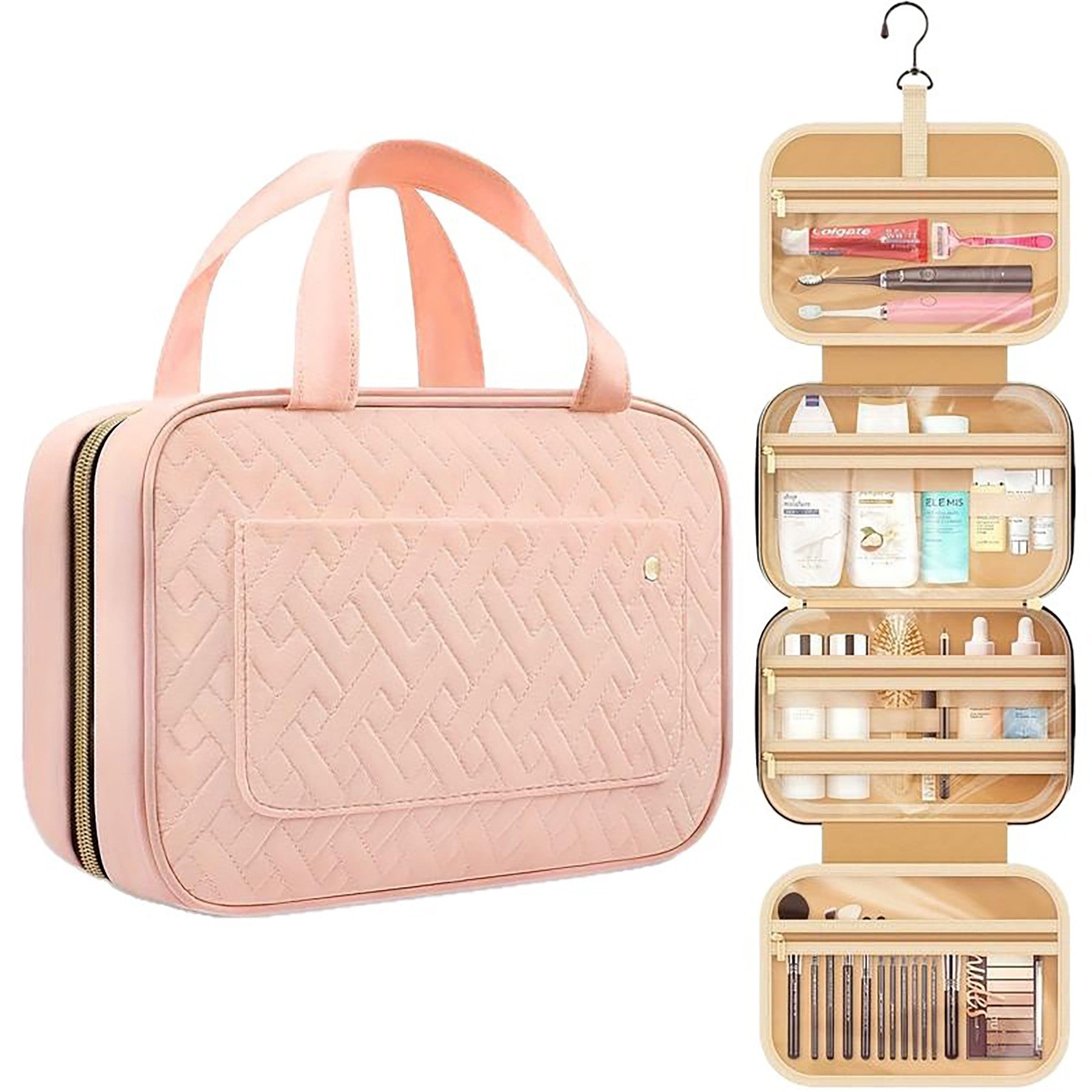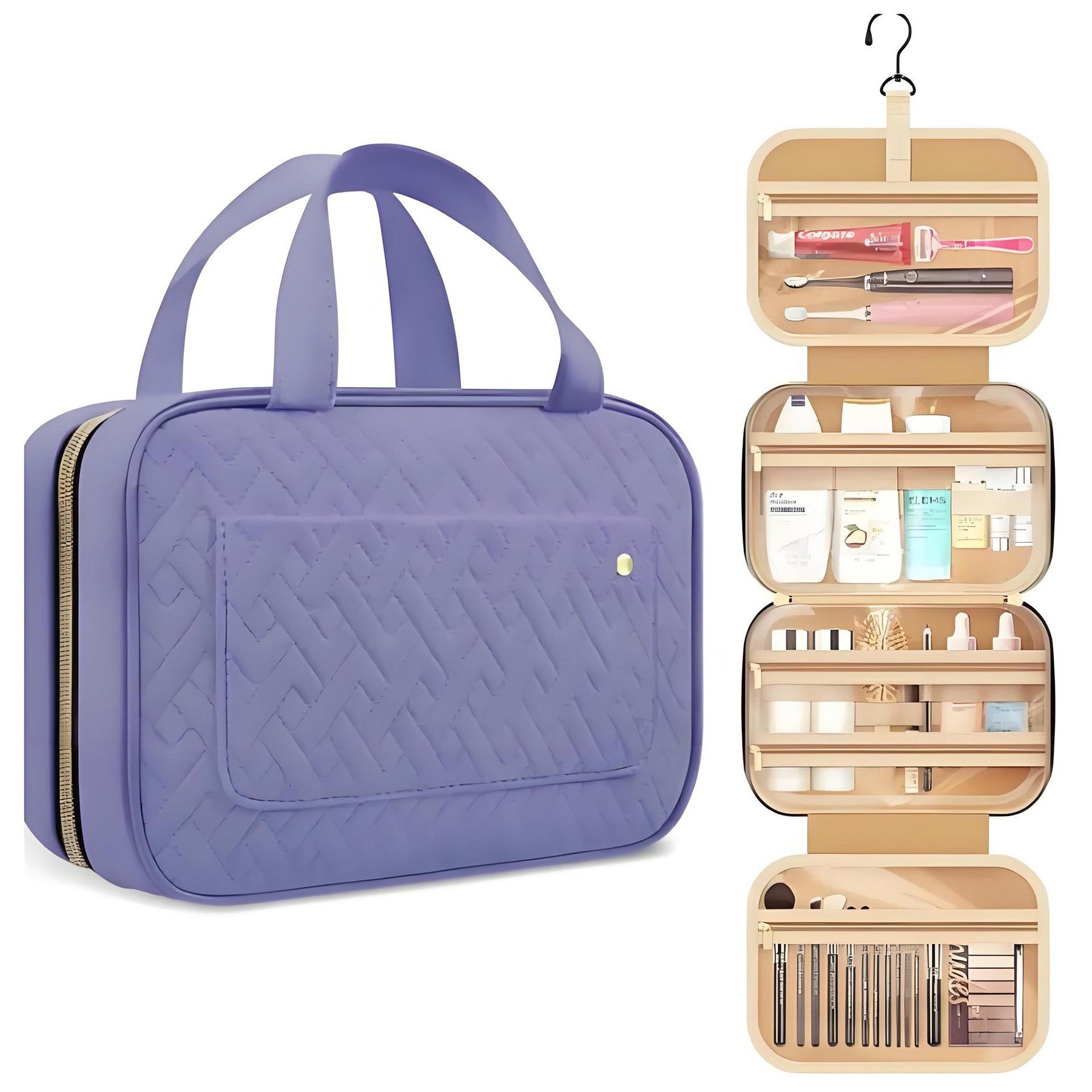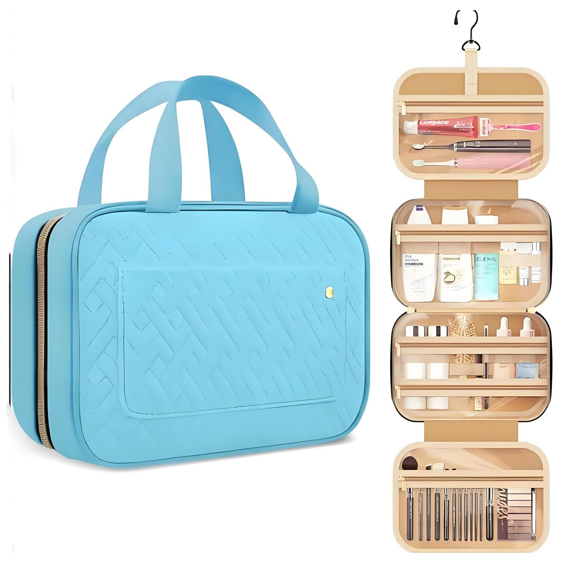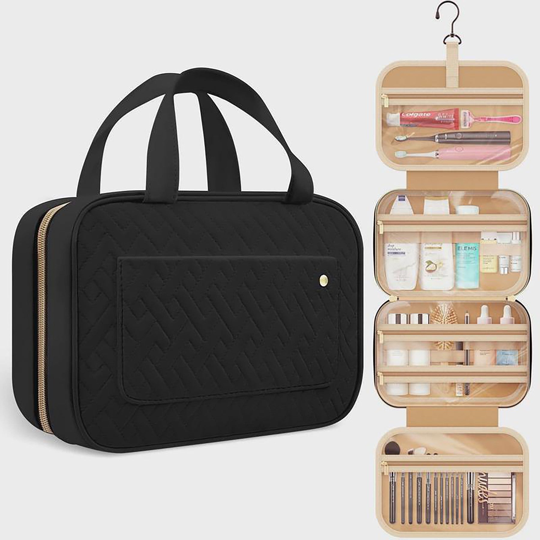 Organize all your essential toiletries with ease using our versatile travel makeup bag. This durable bag features multiple compartments and pockets, perfect for storing everything from hair products to cosmetics to dental accessories. The main interior pocket includes an elastic band to keep bottles upright, while the top handle ensures easy carrying. Our waterproof design provides peace of mind for any trip, while the extra padding protects your precious items. The 360-degree swivel hook allows you to hang the bag wherever you need, making it ideal for overnight stays, weekend getaways, cruises, or international flights. And with clear pockets for easy visibility, you’ll be able to find what you need at a glance. Stay organized and stylish on the go with our travel cosmetic organizer. 4.33″ L x 1.32″ W x 3.05″ H