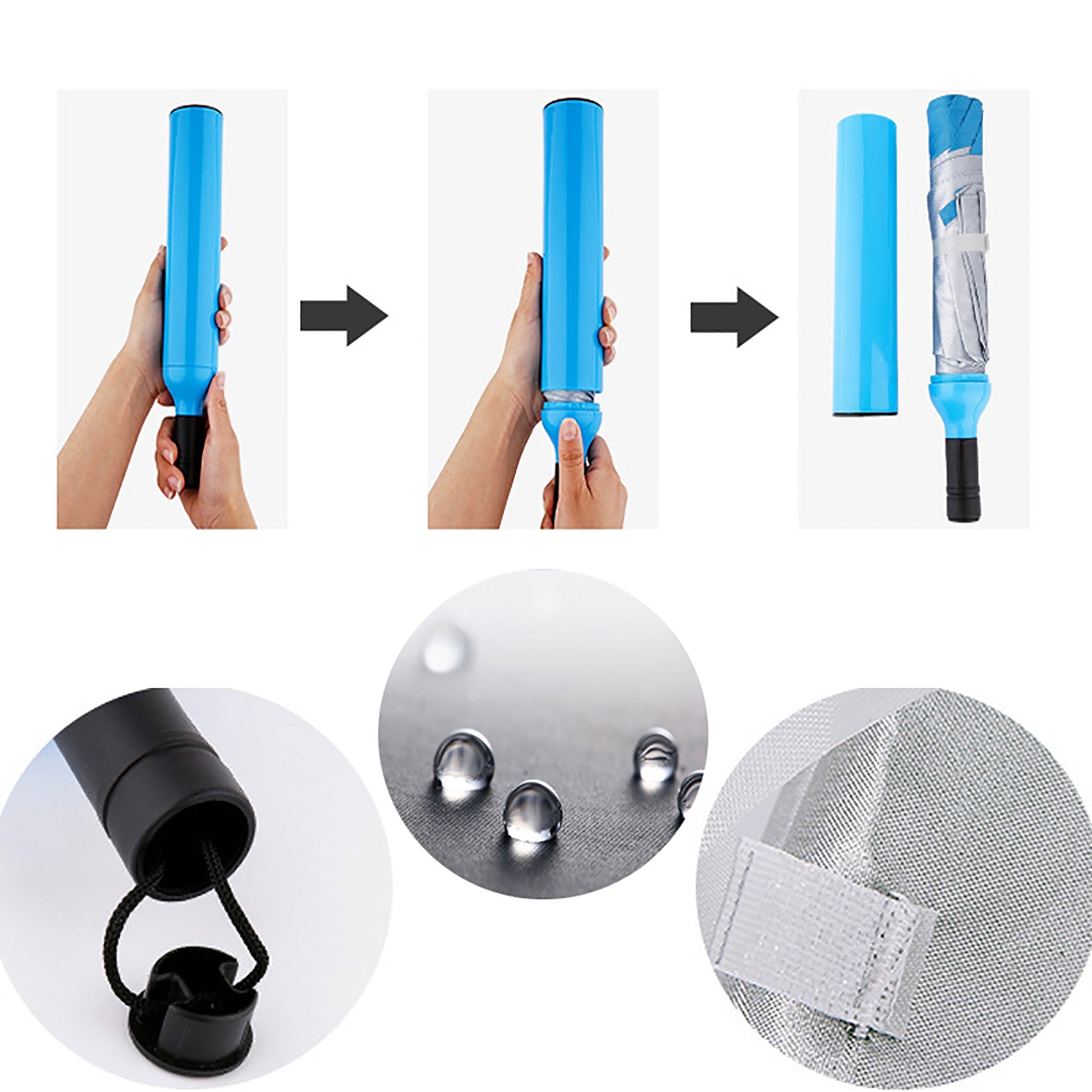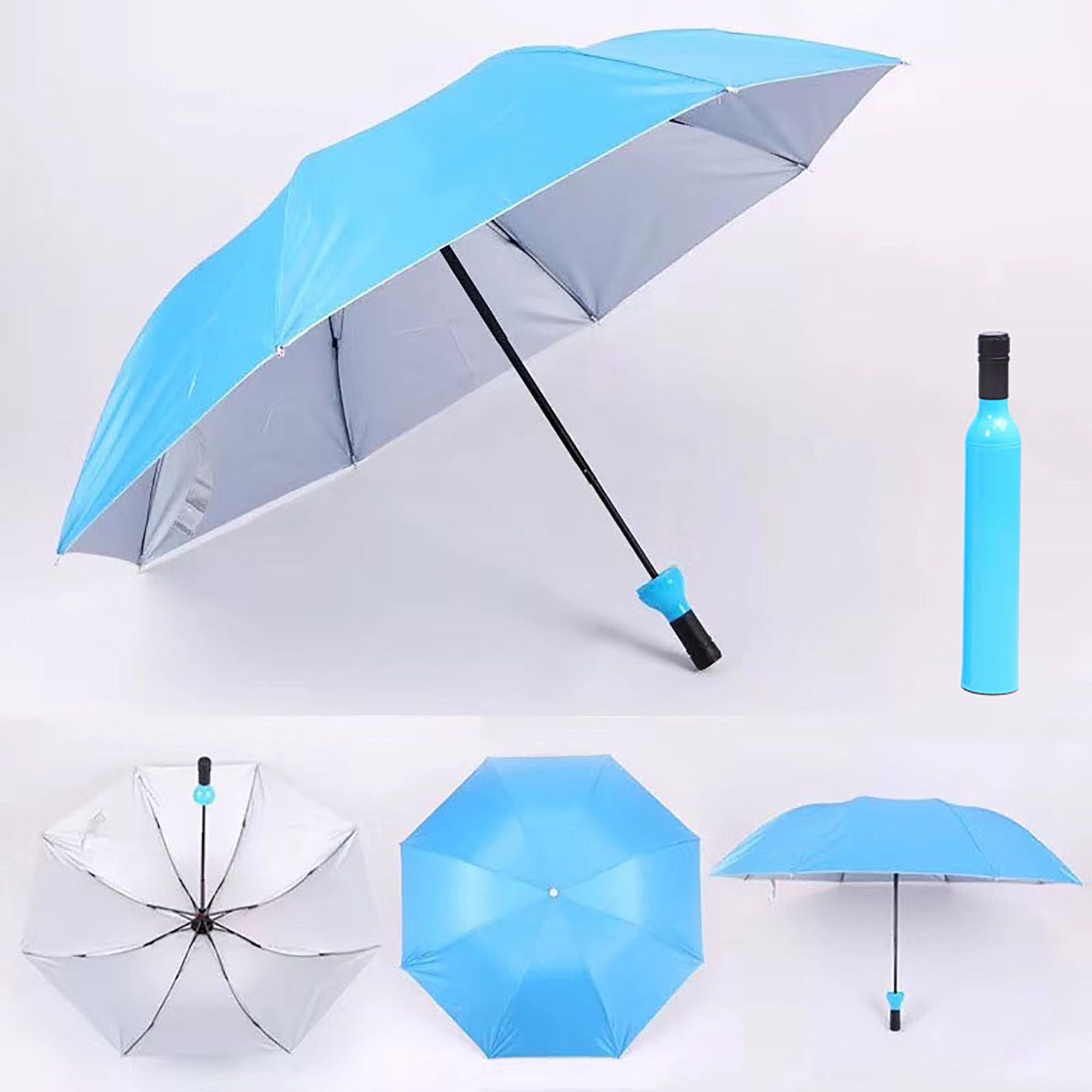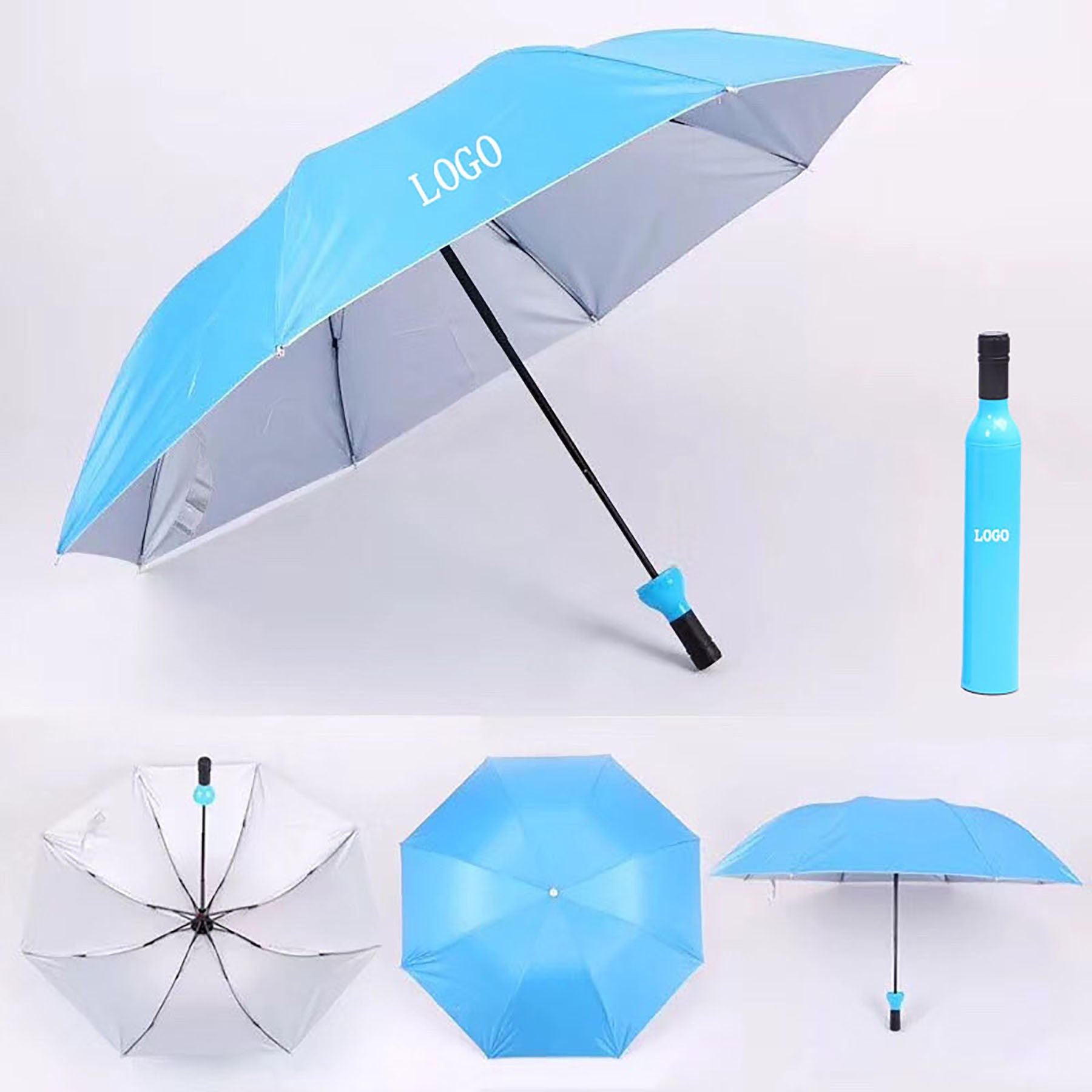 This high-quality 170T polyester bottle umbrella can be customized with your logo. It provides sun, wind, and rain protection with a non-slip rubber handle and wrist strap for easy carrying. Perfect as a promotional gift for parties or events. 2″ L x 12″ W