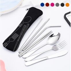 Get the ultimate convenience with our premium portable travel cutlery set made from top-of-the-line stainless steel. It has a sleek mirror finish, ergonomic design, and is reusable and durable for everyday use. Easy to clean and dishwasher-safe. Comes in a convenient bag for on-the-go use during outdoor adventures like travel, picnics, camping, hiking, and more. Perfect for office canteens too. Elevate your dining experience today! 3″ L x 9 1/2″ W