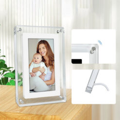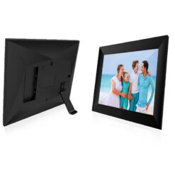 This digital photo frame features a 1280*800 resolution IPS touch screen for clear visuals, with a removable stand for portrait or landscape viewing. The display shows title, weather, and clock, which can be turned on/off with software updates. Easy setup with an intuitive touch screen interface suitable for all ages. A perfect gift for birthdays, weddings, and family gatherings. 15.59′ L x 0.47′ W x 0.47′ H