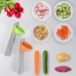 The Spiralizer vegetable slicer is made of high quality, eco-friendly ABS plastic and 304 food grade stainless steel. It has 3 buttons and 4 modes to create vegetables in different sizes with 3 blades. Button 1: julienne cut; Button 2: narrow spiral shape; Buttons 1 + 2: spaghetti shape; Reset key: width spiral shape. Easily switch modes to choose your favorite shapes. The slicer is easy to disassemble and dishwasher safe for easy cleaning. 3.7″ L x 3.7″ W x 6.7″ H