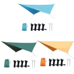 Introducing our waterproof camping tarp tent made from durable 210D Oxford cloth. This versatile tent contains a storage pouch, four wind ropes, and two floor nails for stability. It can be supported by trees, trekking poles, or sticks, providing reliable shelter. The shade net blocks 90% of the sun’s rays, making it perfect for outdoor use. Upgrade your outdoor experience today. 12.6″ L x 9.84″ W
