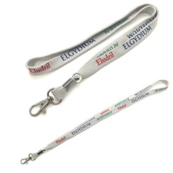 Polyester lanyard with metal bulldog clip. PMS available for product color and imprint. Material: Polyester. 36′ L x 1′ W