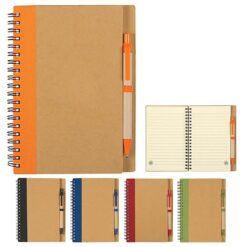 Our eco-friendly Spiral Notebook is perfect for journaling, workshops, conferences, charity events, or academic functions. Crafted from recycled paper with 80 pages, it contains a stylish pen made from sustainable materials. Make a statement of your commitment to the planet with this practical notebook. 5 1/4″ L x 7″ W