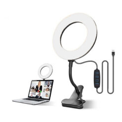 This mini ring light has 56 LED beads with 3 color lighting modes (warm, warm white, white) ranging from 3000k-7000k. Each mode has 10 brightness levels from 1% – 100%. The flexible gooseneck design allows for easy positioning without scratching your monitor screen. The light can be used behind a computer or clamped onto various surfaces for video conferencing, recording, or reading. It is USB powered and compatible with devices that support a USB port. No batteries required. 5.8′ L