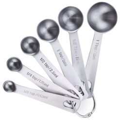 These innovative measuring spoons have cupped and rounded heads for easy access to spice jars. The set contains 6 spoons: 1/8-tsp, 1/4-tsp, 1/2-tsp, 1-tsp, 1/2-Tbsp, and 1-Tbsp connected by a D-shape ring. Each spoon has measurements engraved on the handle for accuracy. Made of 18/8 stainless steel, these spoons are elegant, durable, and easy to clean. Perfect for professionals and home cooks alike. 5 7/16″ L x 1 3/4″ W x 1 3/16″ H