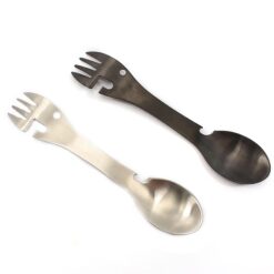 This stainless steel utensil is durable, lightweight, and compact – perfect for outdoor activities like camping, fishing, or hiking. It contains a spoon, fork, bottle opener, and can opener. Add your logo for a unique touch to your gear. 7.09″ L x 1.38″ W