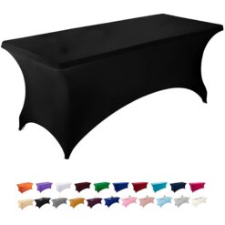 This tablecloth is made from polyester fabric. It is stretchy, wrinkle-resistant, stain-resistant, and thick. We designed four small elastic pockets that easily slip over the table’s four legs. This keeps the tablecloth taut and prevents it from blowing away. Installation is as simple as tucking the table legs into the four small elastic pockets. In about 30 seconds, your neat tabletop is ready. Ideal for birthday parties, anniversaries, holidays, weddings, hotel receptions, and banquet table settings. Also suitable for craft exhibitions, jewelry displays, trade show booths, and more. 48.03″ L x 23.62″ W x 29.92″ H