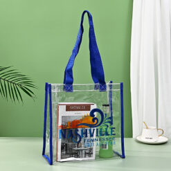 Reduce plastic waste with this stylish transparent tote bag made of durable PVC material. It features a colorful dual nylon webbed handle and non-woven trim accents, making it perfect for the beach or pool. Choose from a variety of two-tone shades and customize with your logo for a great branded giveaway at events. 12′ L x 12′ W x 6′ H