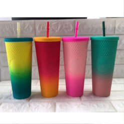 The cup body has a reserved LOGO position for customization, while the Fully Studded model is covered in rivets with no reserved LOGO place. This 24oz Double Layer Soft Studded cup comes with a straw and holds 24 ounces. It measures 9′ high with a top diameter of 4 inches. Hand wash only; not microwave or dishwasher safe. 11.6′ L x 4.4′ W x 4.4′ H