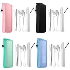 Introducing our premium cutlery set made from high-quality 304 stainless steel, resistant to rust and corrosion. Set contains Dinner Fork, Tablespoon, Knife, Chopsticks, Cleaning Brush, Straight Straw, Bent Straw, Carrying Case, and Pouch. Perfect for home, offices, restaurants, hotels, and outdoor activities. Upgrade your dining experience with our eco-friendly set today! 10.03″ L x 2.95″ W x 1.2″ H