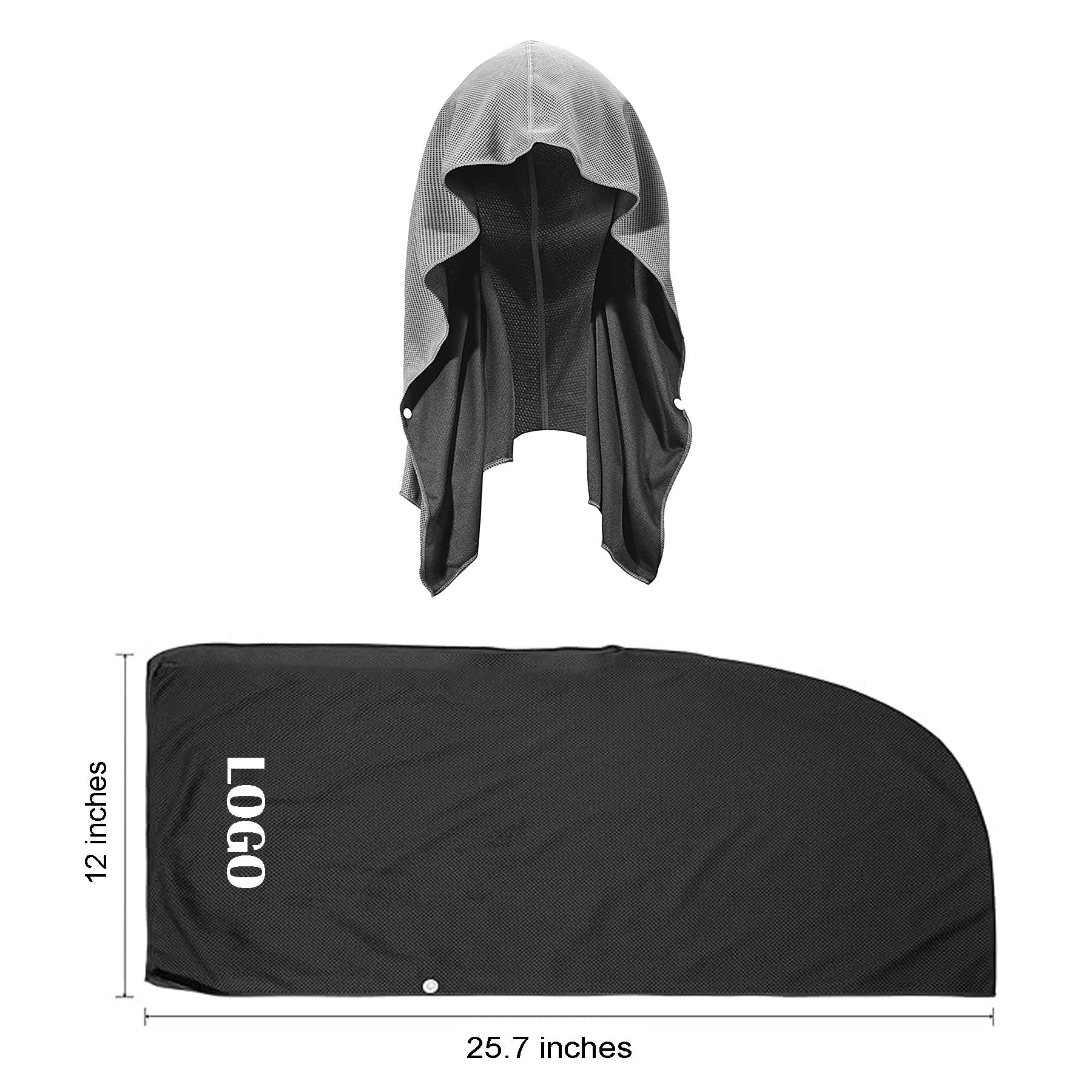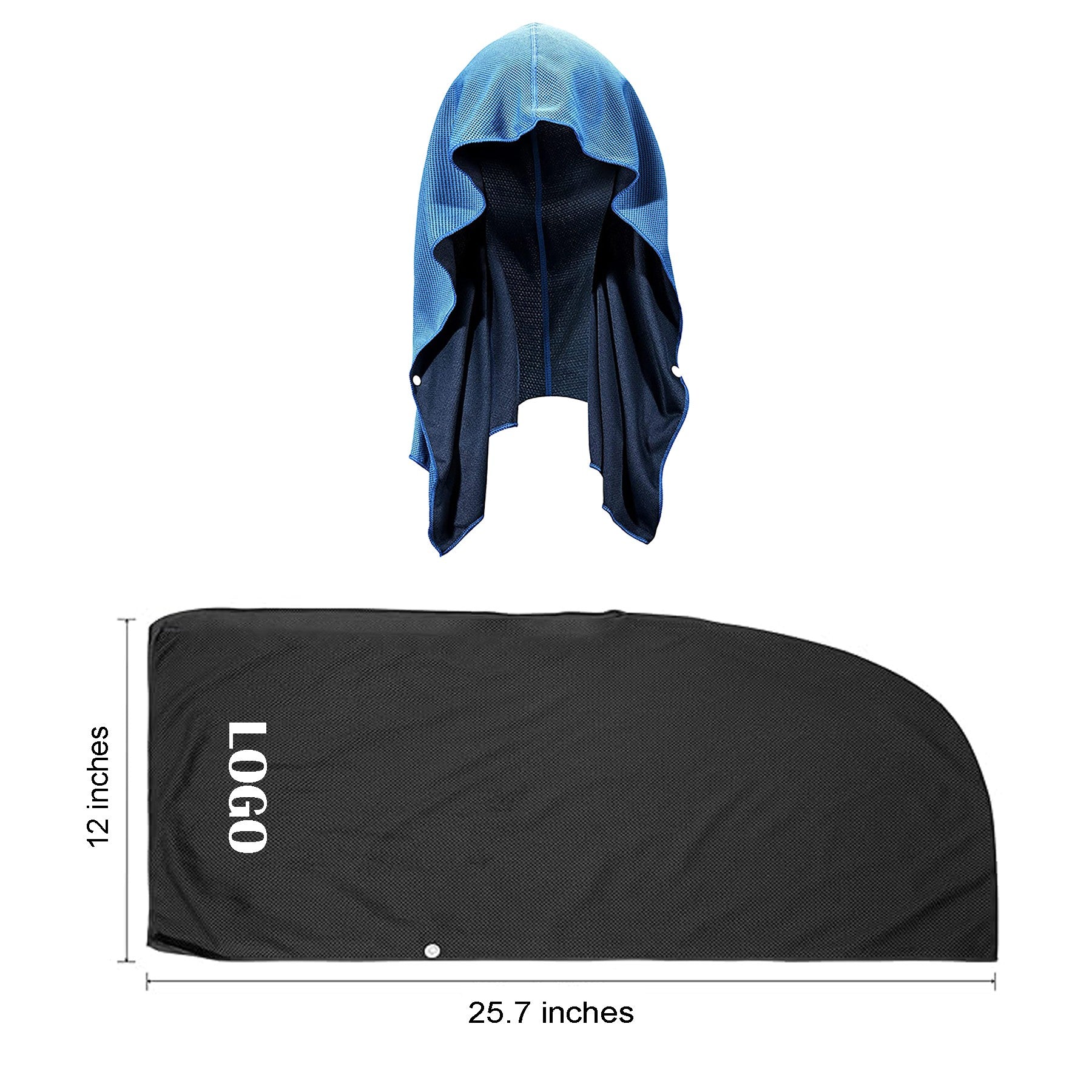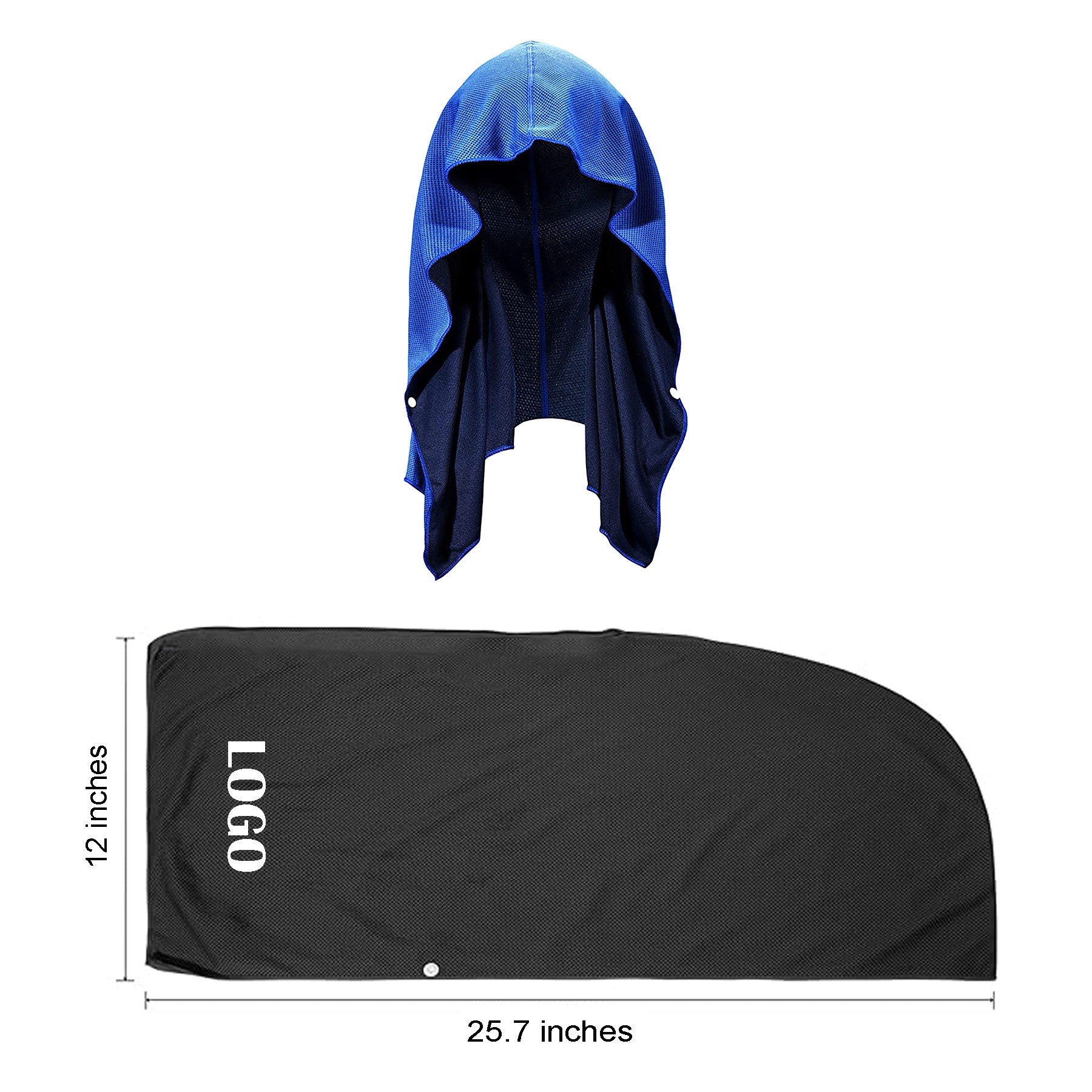 Our innovative cooling hoodie towel keeps you cool by wicking away sweat, blocking UVA/UVB rays, and preventing sweat from getting in your eyes. Made from breathable, quick-drying fabrics, it stays cool for up to 3 hours. Perfect for hot flashes, outdoor activities, workouts, fever relief, heatstroke prevention, and sun protection. It contains no chemicals and has buttons at the neck for a secure fit. Wear it under a helmet, or use it as a headscarf or neck towel for various activities. 25.68″ L x 11.85″ W x 0.04″ H