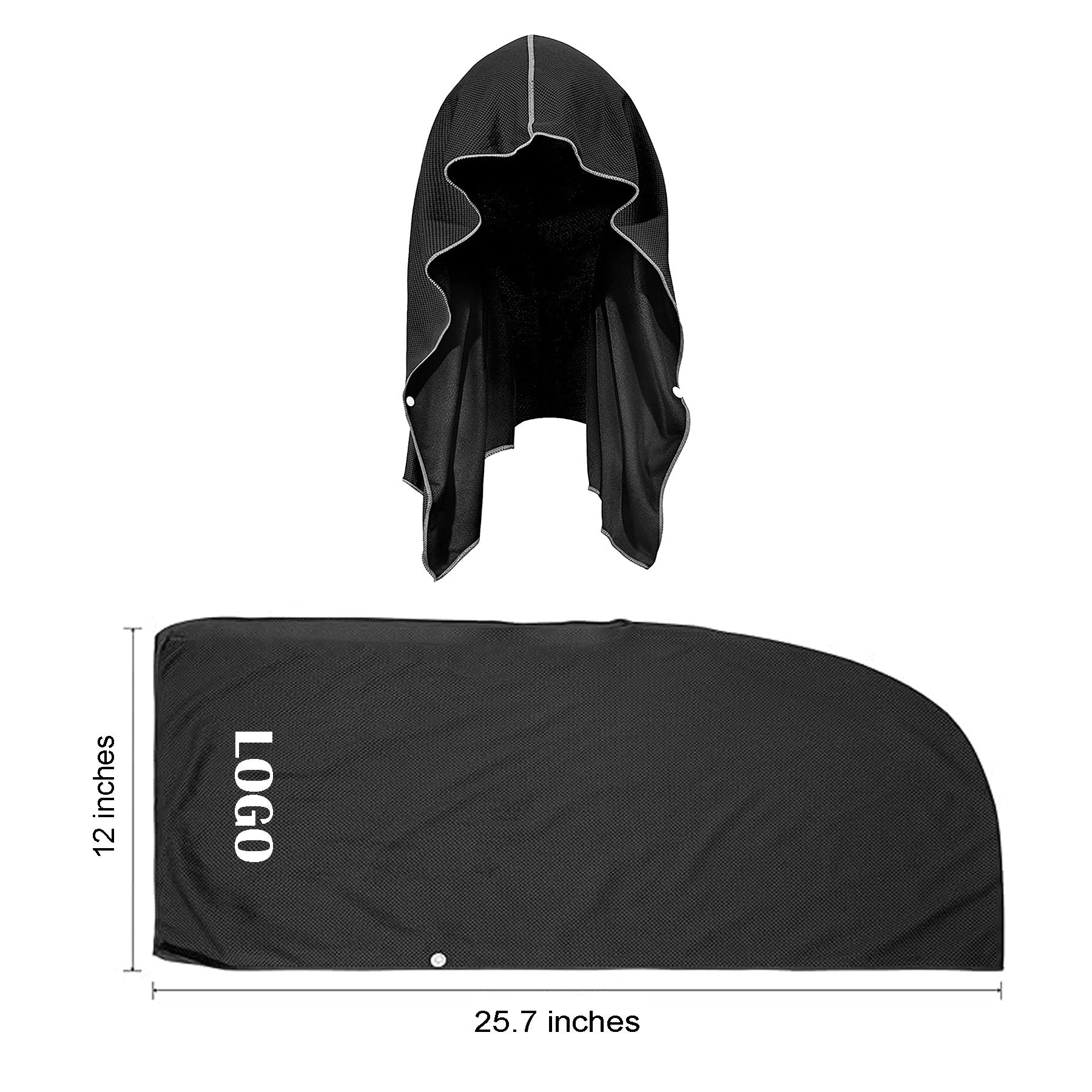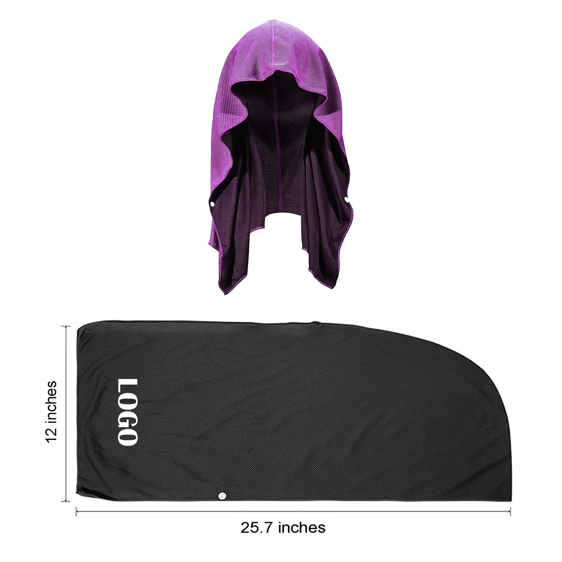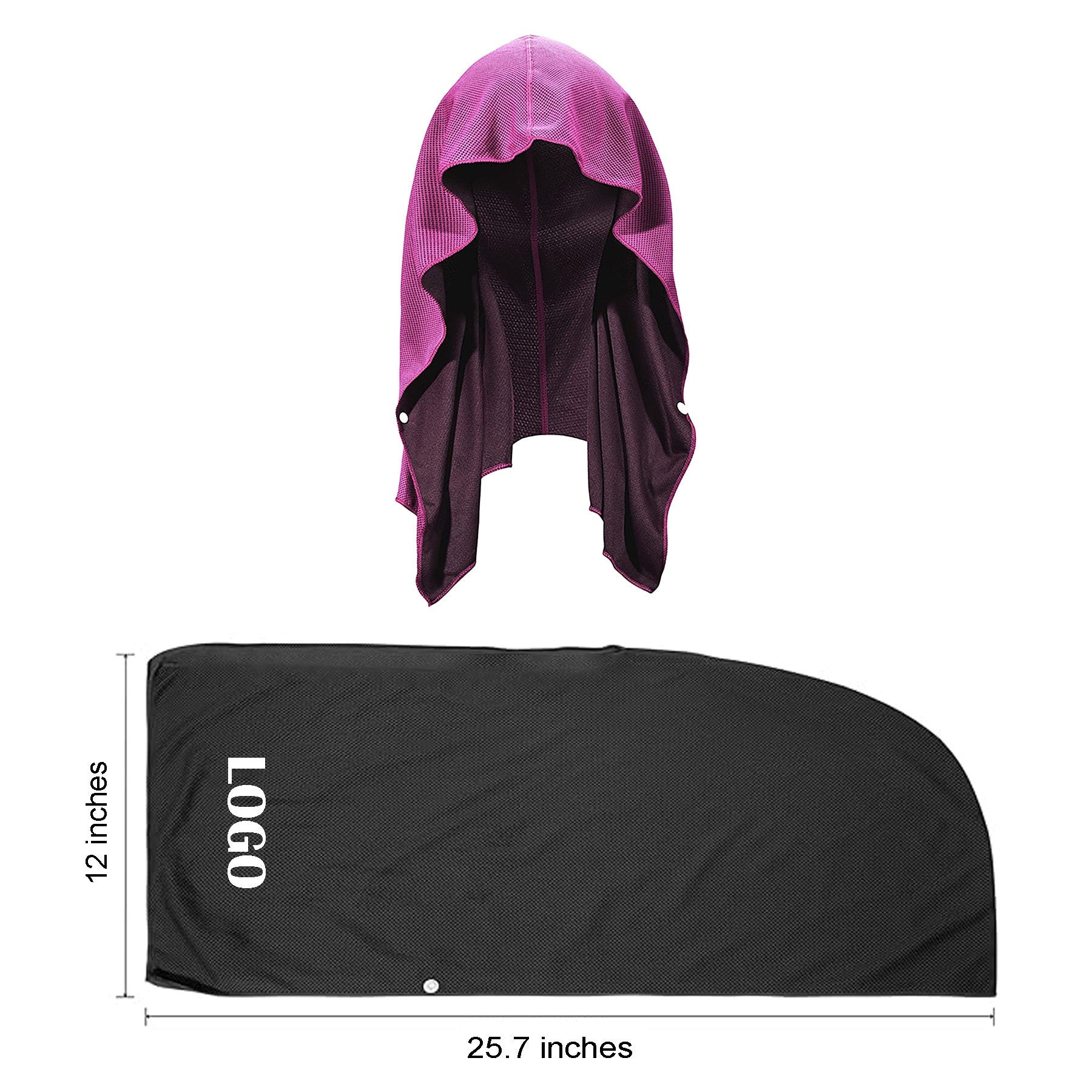 Our innovative cooling hoodie towel keeps you cool by wicking away sweat, blocking UVA/UVB rays, and preventing sweat from getting in your eyes. Made from breathable, quick-drying fabrics, it stays cool for up to 3 hours. Perfect for hot flashes, outdoor activities, workouts, fever relief, heatstroke prevention, and sun protection. It contains no chemicals and has buttons at the neck for a secure fit. Wear it under a helmet, or use it as a headscarf or neck towel for various activities. 25.68″ L x 11.85″ W x 0.04″ H