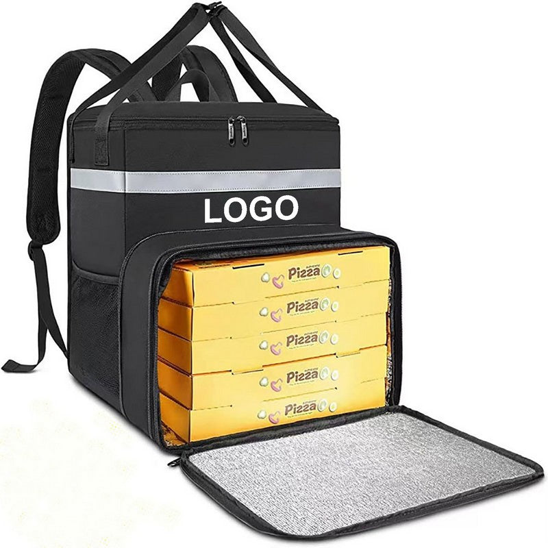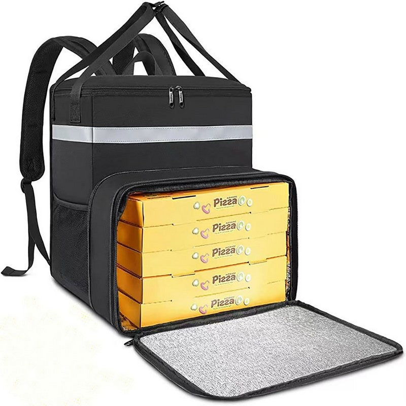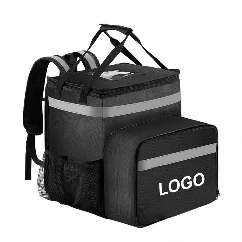 Food delivery bag with padded back and shoulder straps for comfort during long shifts. Made with durable, water-resistant material to withstand wear and tear. Features side cup holders, upgraded strap design, and reinforced stitching for secure drink storage. Leak-proof and insulated liner keeps food hot or cold for hours. Reflective strips for visibility at night. Front pocket for napkins, utensils, and condiments. Transparent pocket for order labels. 13.78″ L x 9.84″ W x 9.84″ H