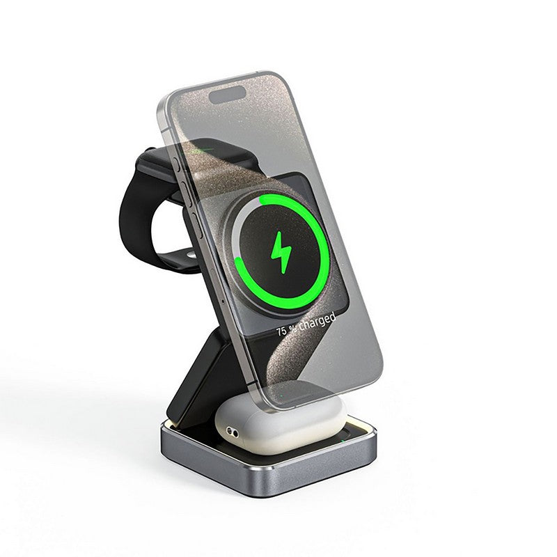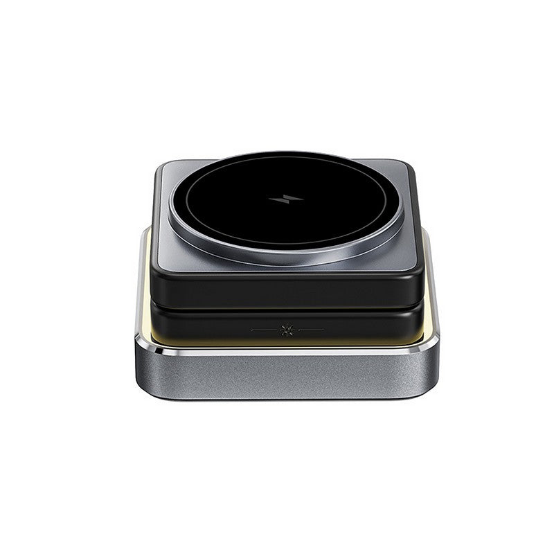 This 3-in-1 magnetic wireless charger is compatible with all qi devices, providing fast power without multiple cables. It integrates seamlessly into your lifestyle at work, home, or while traveling, with a built-in night light. It safety features like foreign object detection, overheating, and short circuit prevention. Durable metal shock-absorbing shafts support the foldable structure for stability at any angle. 2.95″ L x 2.95″ W x 1.44″ H
