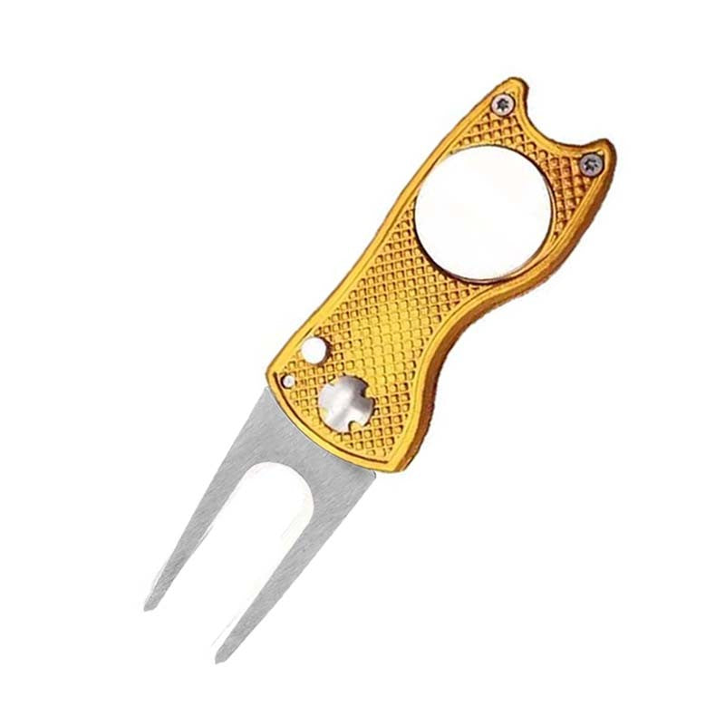 The golf divot repair tool is made of quality stainless steel and aluminum, durable and solid, lightweight and portable. the fork can clean groove, fix divot, and sharpen your golf pencils; Magnetic design helps you mark the place; And the U-shape bottom can hold your golf club.This foldable golf divot tool to avoid catch on your pocket or finger.Customized design is available. 4.49′ L x 1.14′ W