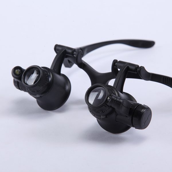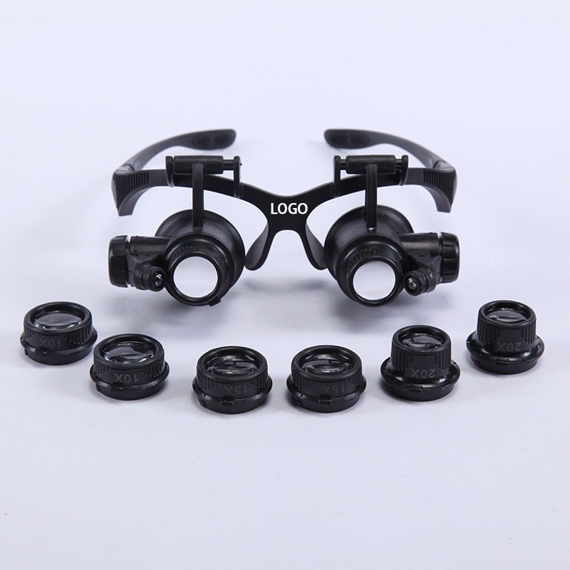 Watch repair magnifier glasses has 4 different lens magnifications 10X, 15X, 20X, 25X. You can replace and use it according to your needs. You have to be close to the object to focus on it, which is more suitable for professionals. Head mount magnifier contains two adjustable brightness LED lights, which can help work in low light conditions, and includes 6 button batteries, which you can turn on by rotating about 30 degrees clockwise. You can use the watch repair magnifier upgraded version directly. If you use it for a long time, it is recommended to disassemble the bracket and replace it with a strap-type headband, which can be worn for a long time and reduce fatigue. You can customize any company logo.