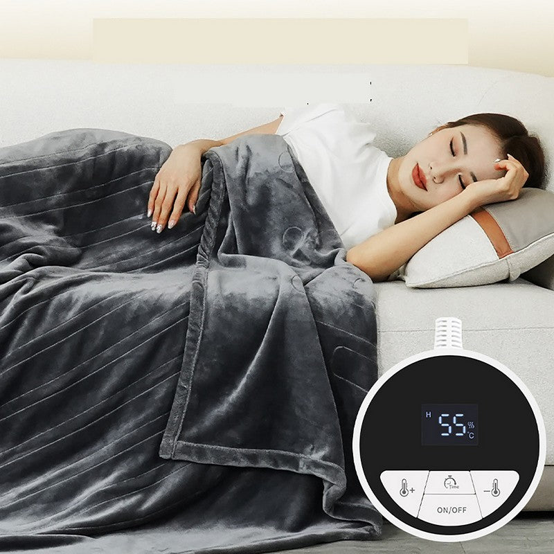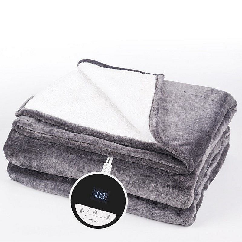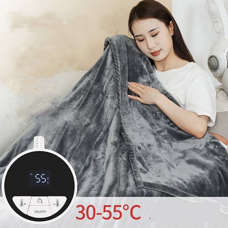 Multi-functional heating blanket with intelligent temperature control, adjustable range of 30-55 degrees Celsius. Evenly dissipates heat to warm the whole body. Features a digital display and automatic power-off after 12 hours. A-side is flannel, B-side is lamb wool, skin-friendly and delicate. Double-layer temperature locking. 50″ L x 59.84″ W