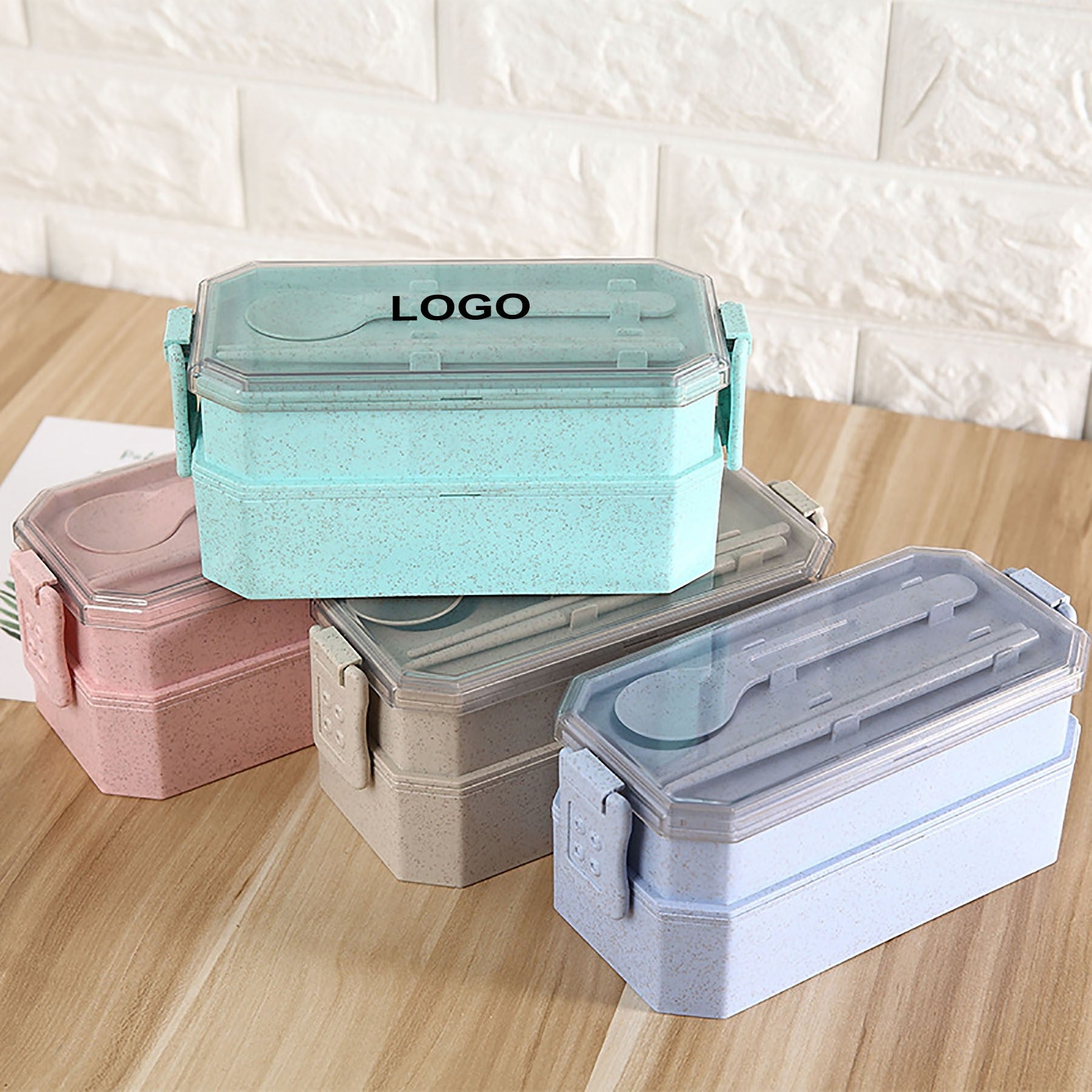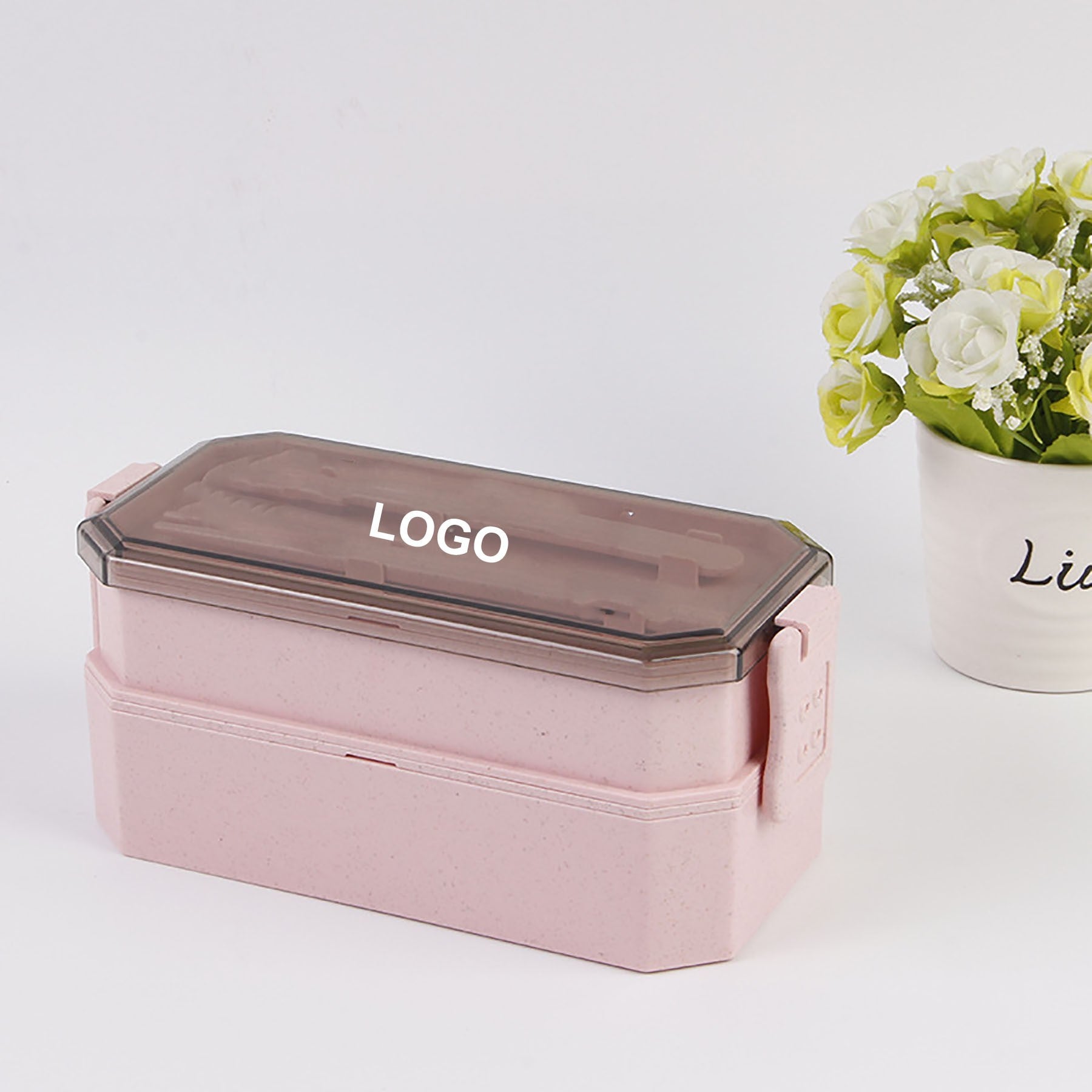 Indulge in eco-friendly dining with our innovative lunch box crafted from durable wheat fiber and topped with a sleek PP cover. Complete with a convenient spoon and chopsticks, this microwave-safe gem features double compartments for easy organization. For added peace of mind, it boasts a double-sided lock for secure closure. Plus, personalize your lunch box with a custom logo on both the side and lid for a touch of uniqueness. 7 7/8″ L x 3 1/2″ W x 3 1/8″ H