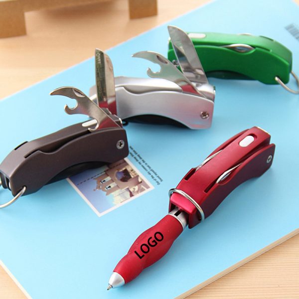 5 In 1 multi-function tool ballpoint pen with 1 white LED light. Pen with rubber grip, knife, bottle/can opener and matching carabiner. Slide button to turn on/off. Size: 2.8″ L x 1.1″ W