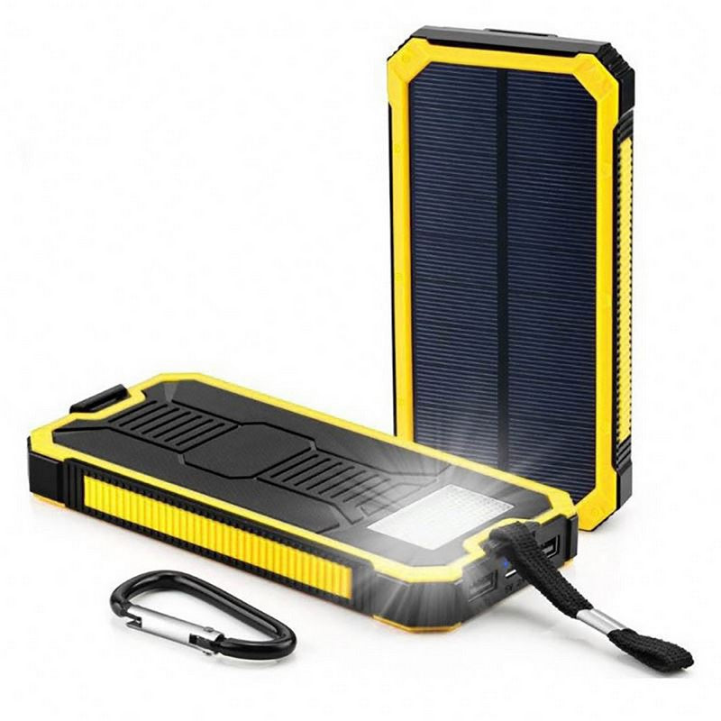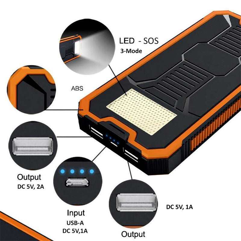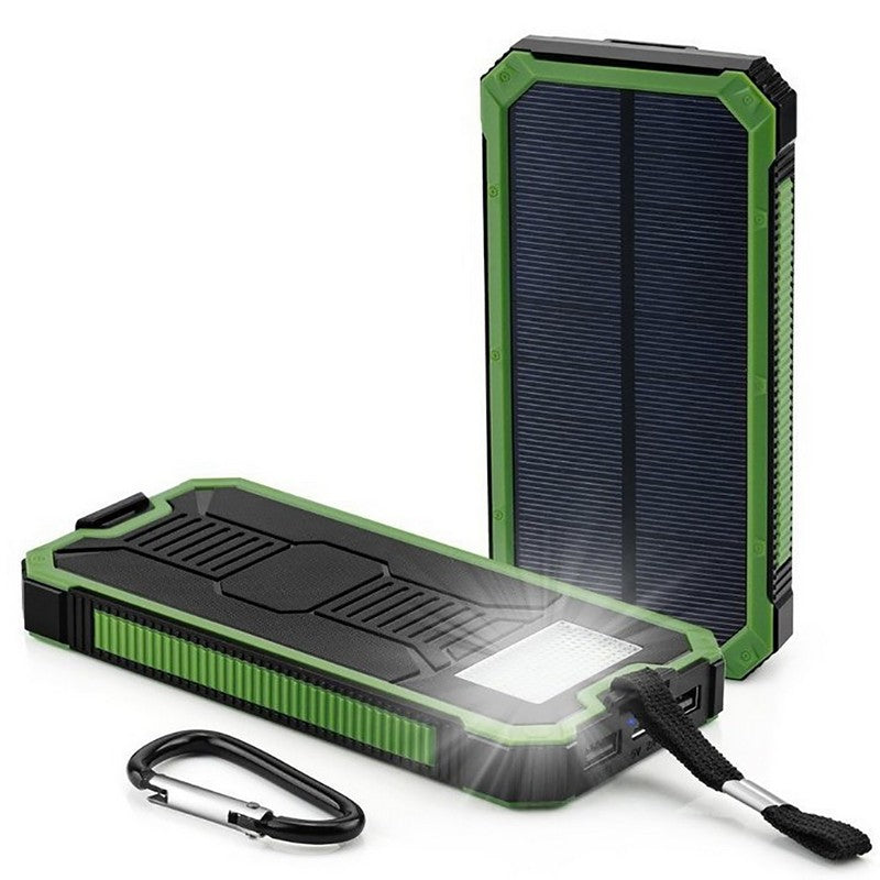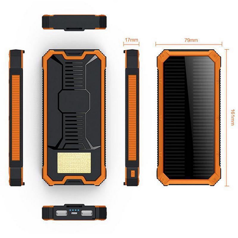The solar charger has a capacity of 200,00 mah, the charger charges the power pack from a wall outlet, or place it in direct sunlight or under a light source for charging (ideal when traveling or camping where there is no wall outlet), and has 3 lighting modes (steady bright, sos strobe and high pitched sos strobe). Can be used as a flashlight with a steady sos strobe mode. Also comes with a hook and loop. Ideal for camping, hiking or emergency use. 3.07′ L x 6.3′ W x 0.71′ H