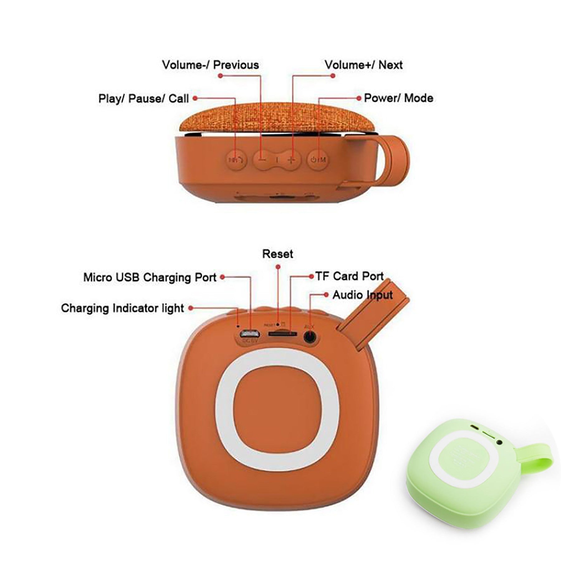 This mini wireless speaker is made of eco-friendly ABS and powered by a rechargeable lithium battery. Compact and durable with a built-in carabiner, it’s perfect for music lovers and outdoor enthusiasts. Features include hands-calling, voice assistant support, TF card slot, and rich stereo sound. 3.46′ L x 3.26′ W x 1.96′ H