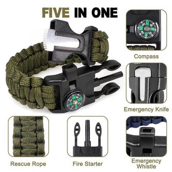 Multi-function survival paracord bracelet with emergency knife, fire starter, whistle, compass, SOS light and thermometer. Start a fire when you need with the Flint Starter. Get help using the Emergency Whistle and SOS light. Find your way with the Compass. Use the Sawtooth to cut ropes. A great accessory for hiking, camping, boating, outdoor and safety programs. The price include 1 color 1 side 1 location imprint charge and shipping fee! Your logo can be customized!