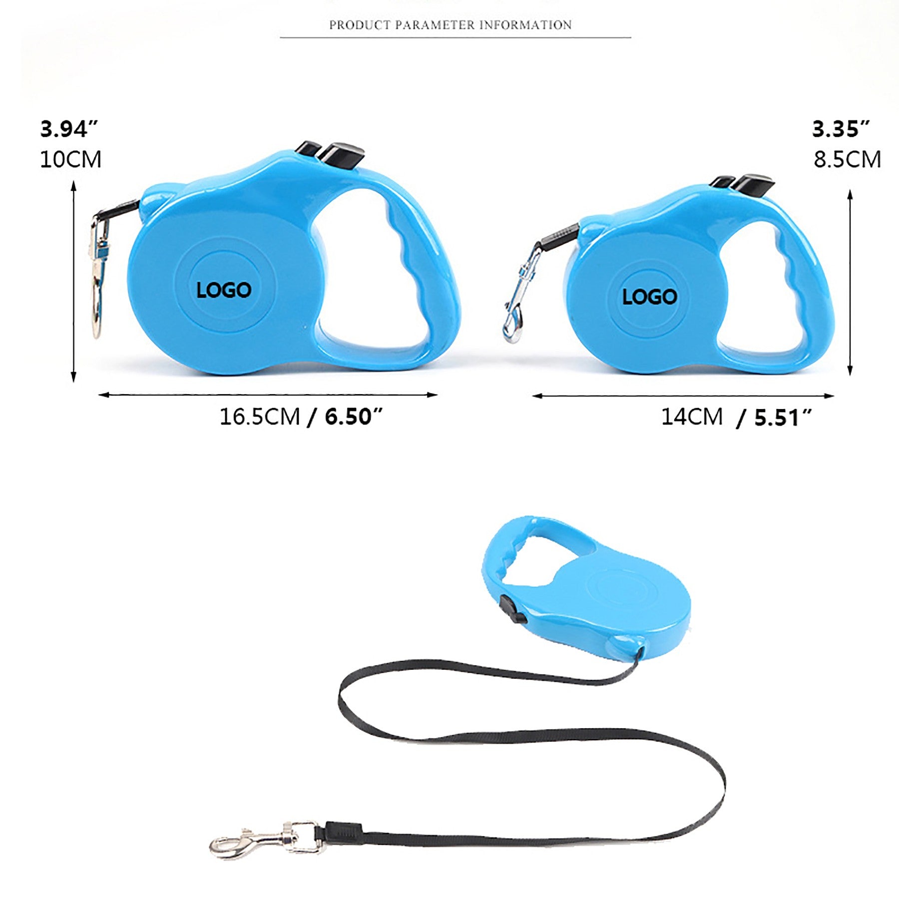 The hook is made of kirsite. The ABS shell can be printed your logo on it. The nylon rope is 118″. The nylon rope is lengthen and shorten Unrestrictedly. You can use one finger to control your pet’s range of motion, to make sure your pet is safe, avoid lost or accident. This rope features a retractable design and braking system to give your pet the feeling of liberty while letting you keep your four-legged friend nearby. Enjoy the outdoors with peace of mind with the Traction Rope for dogs. 5 1/2″ L x 3/4″ W x 4 3/4″ H