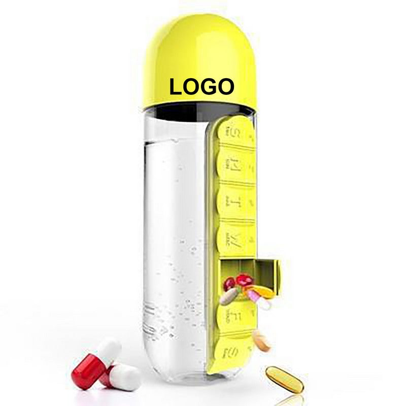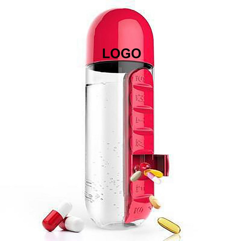 The water bottle has 7 day section 3 Large Sized Pill.The 7 Day Pill box with water bottle is 20 ounce/600ml capacity.The pill box is removal and easy to clean.Medicine combined with water glass,It is only 182g and more convenient for outdoors. 9.05′ L x 2.95′ W x 2.95′ H