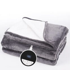 Multi-functional heating blanket with intelligent temperature control, adjustable range of 30-55 degrees Celsius. Evenly dissipates heat to warm the whole body. Features a digital display and automatic power-off after 12 hours. A-side is flannel, B-side is lamb wool, skin-friendly and delicate. Double-layer temperature locking. 50′ L x 59.84′ W