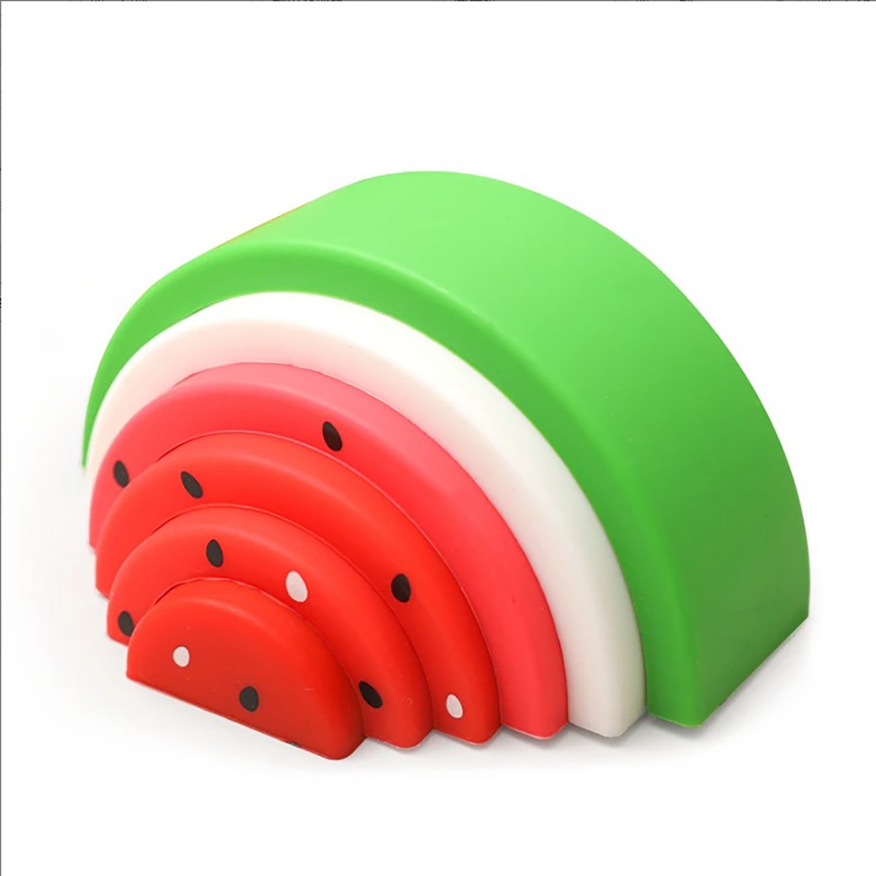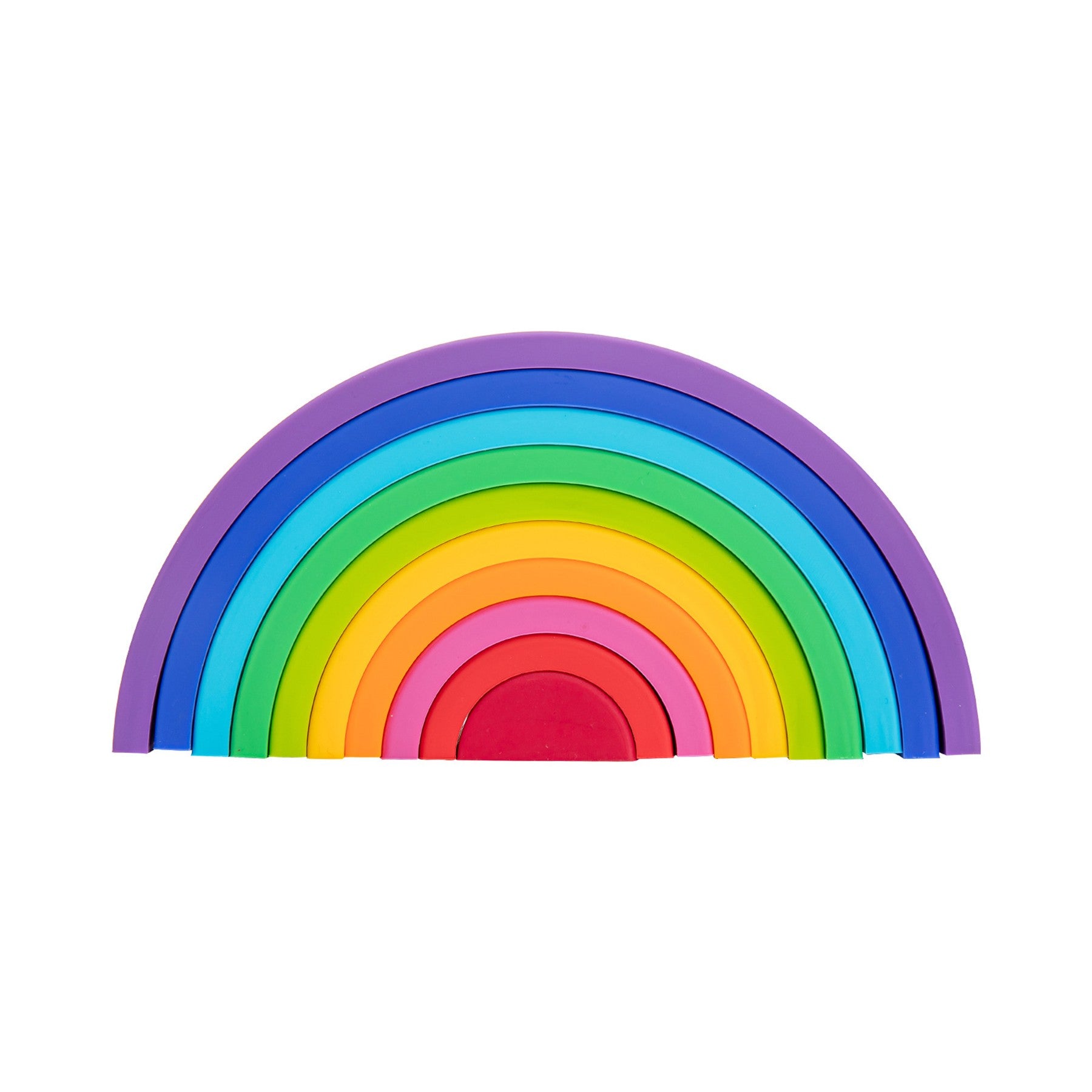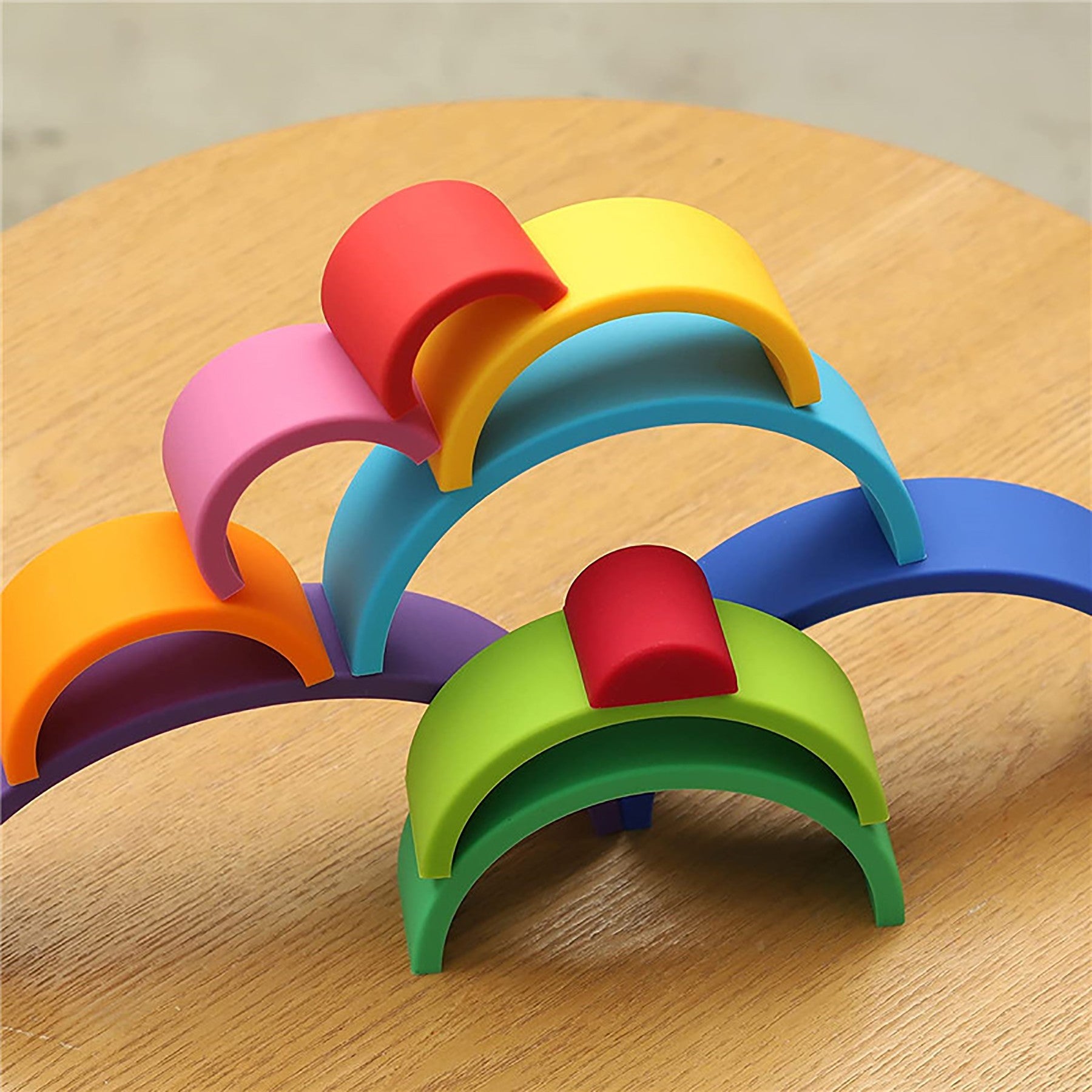 Silicone stacking toy with 10 colorful and sized arcs made of 100% silicone. Durable and safe compared to wood toys, with a smooth surface that aids in balance and reduces frustration. Enhances color recognition, imagination, creativity, and hand-eye coordination. Thick blocks prevent swallowing accidents. Ideal gift for babies. Easy to clean with water or boiling. 7 1/4″ L x 3 5/8″ W x 1 1/8″ H