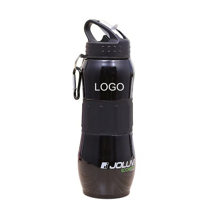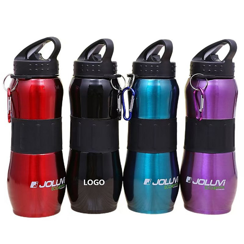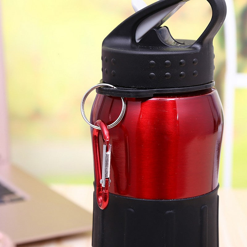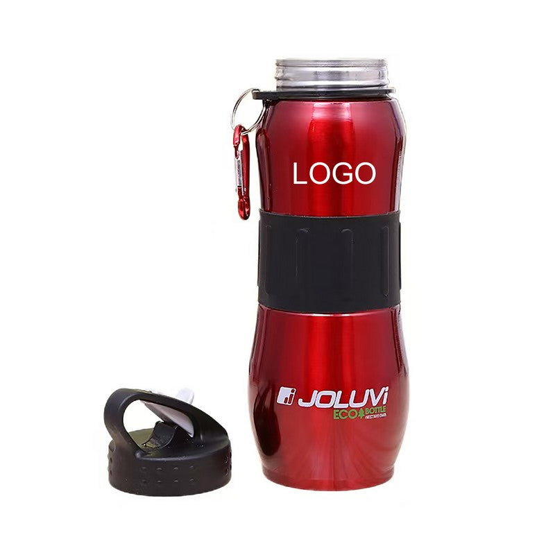 Stay energized during your workout with this sleek stainless steel bottle. It has a rubber grip, spill-resistant lid, and meets FDA standards. The 28-ounce bottle comes with a split ring and carabiner clip for easy transport. Stay refreshed and hydrated with this durable and stylish bottle. 9.84′ L