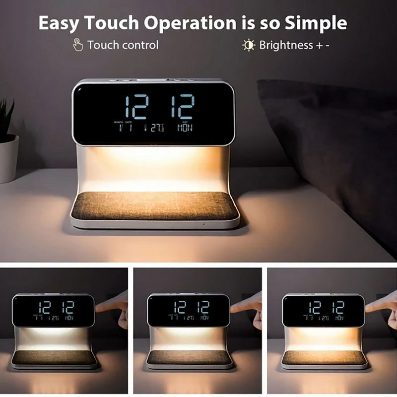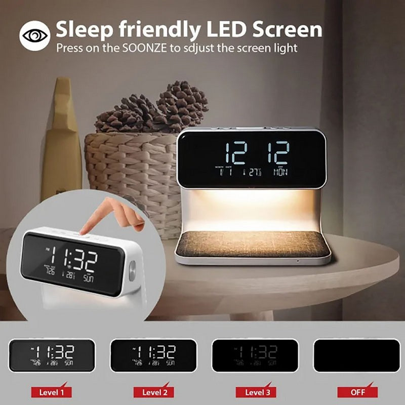 This sleek white unit combines an alarm clock, night light, and 15w fast wireless charging in one space-saving design for bedside convenience. It features a wireless charging station that is compatible with iPhone and Android devices (type-c adapter + cable). The touch control allows you to switch between bright (reading), low (ambient), and sleep mode (soft night light) to reduce eye strain. It also displays time (12/24h), date, month, temperature, and has dual alarms with a snooze function for precise scheduling. 7.09″ L x 4.13″ W x 5.94″ H