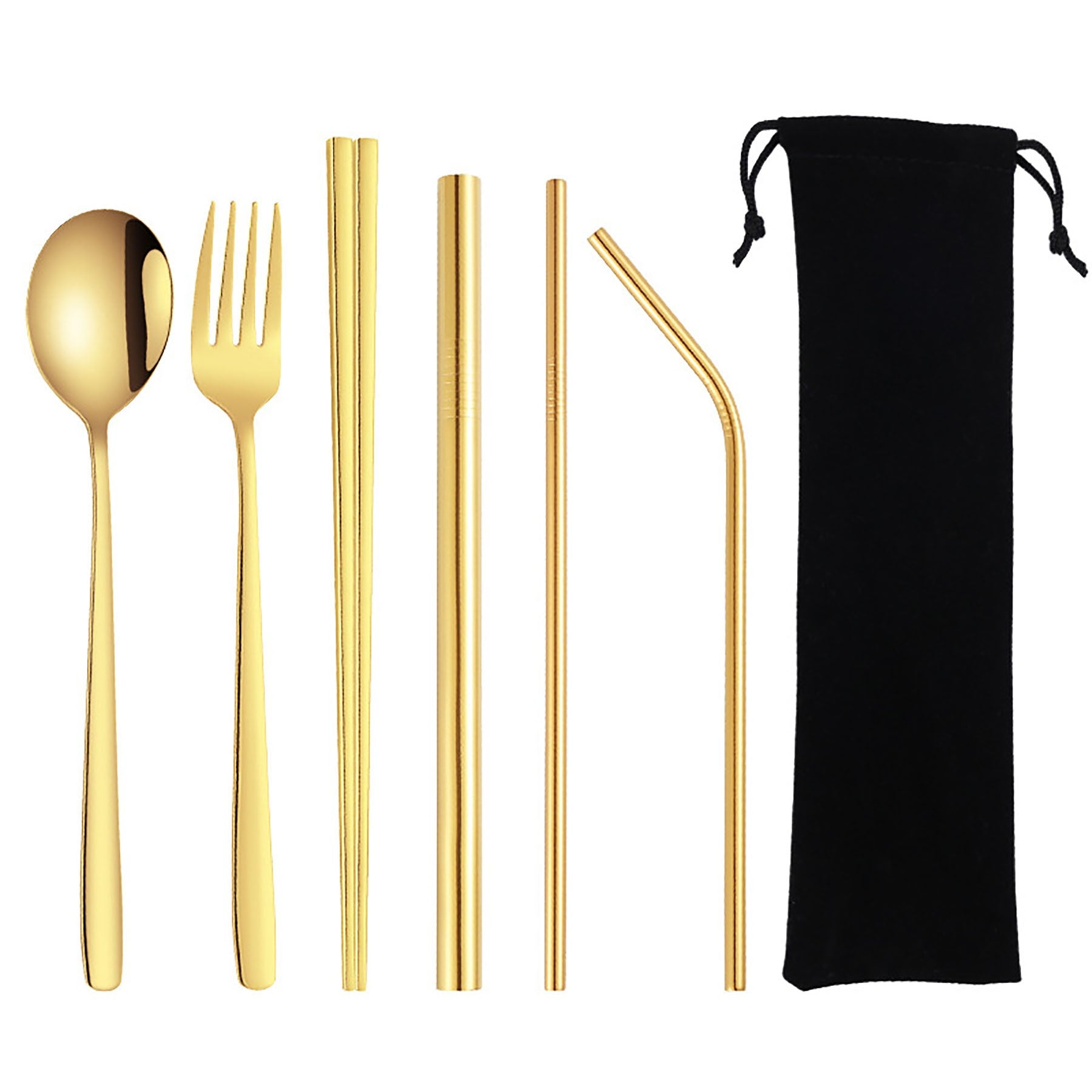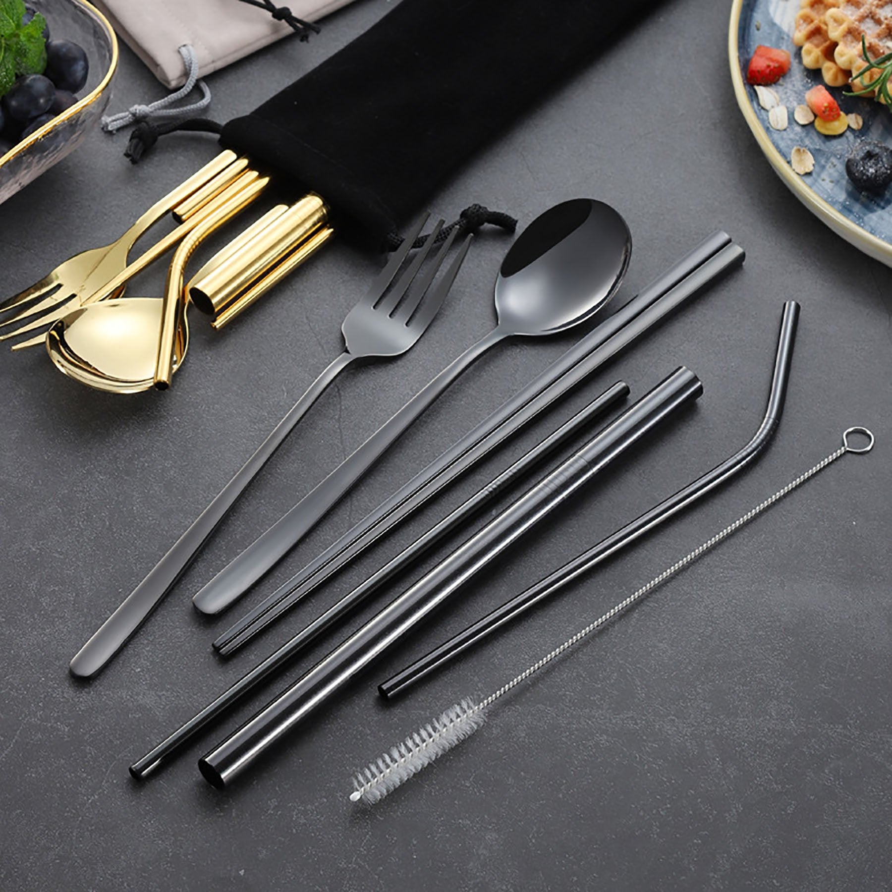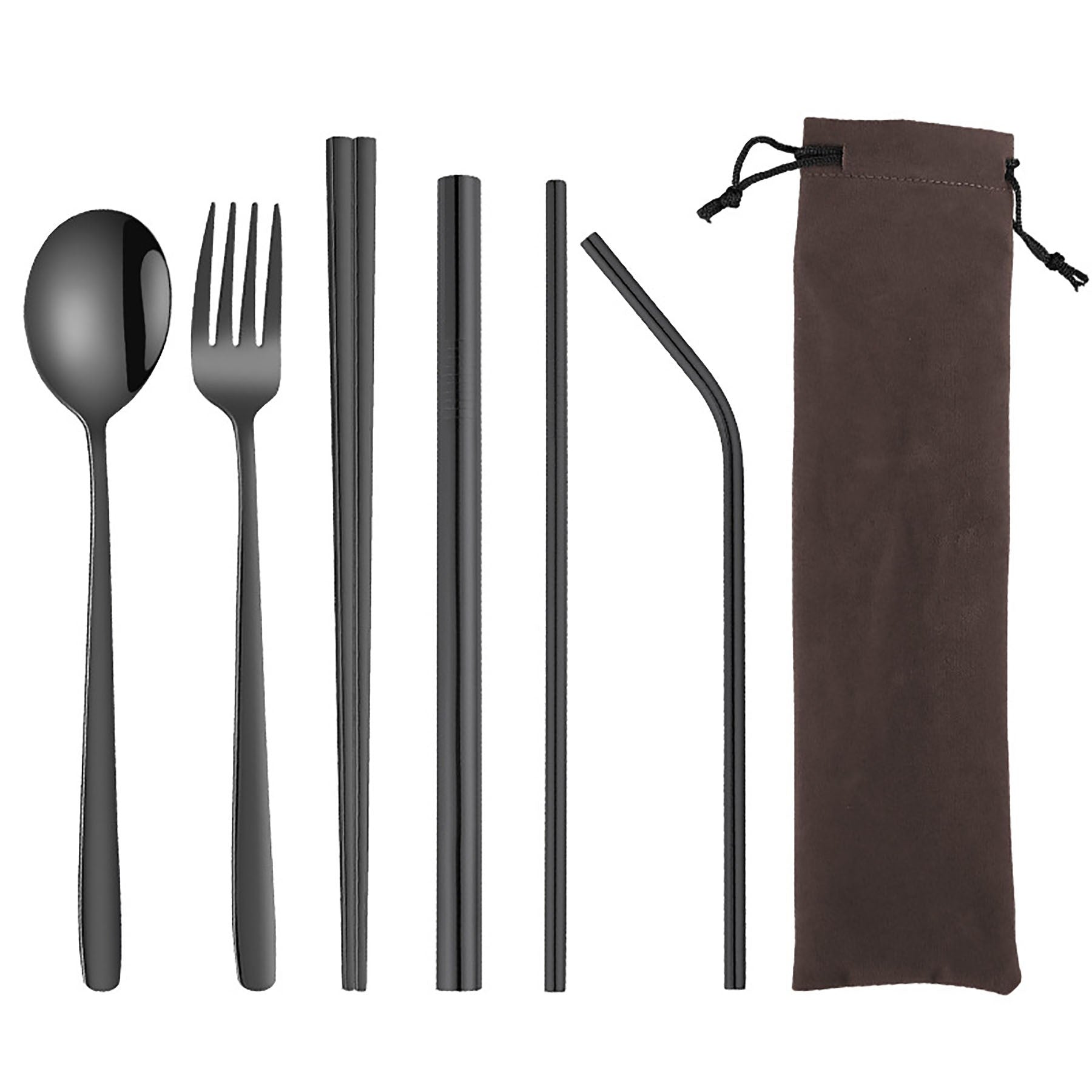 Introducing our premium cutlery set made from high-quality 304 stainless steel, resistant to rust and corrosion. Set contains Dinner Fork, Tablespoon, Knife, Chopsticks, Cleaning Brush, Straight Straw, Bent Straw, Carrying Case, and Pouch. Perfect for home, offices, restaurants, hotels, and outdoor activities. Upgrade your dining experience with our eco-friendly set today! 10.03″ L x 2.95″ W x 1.2″ H