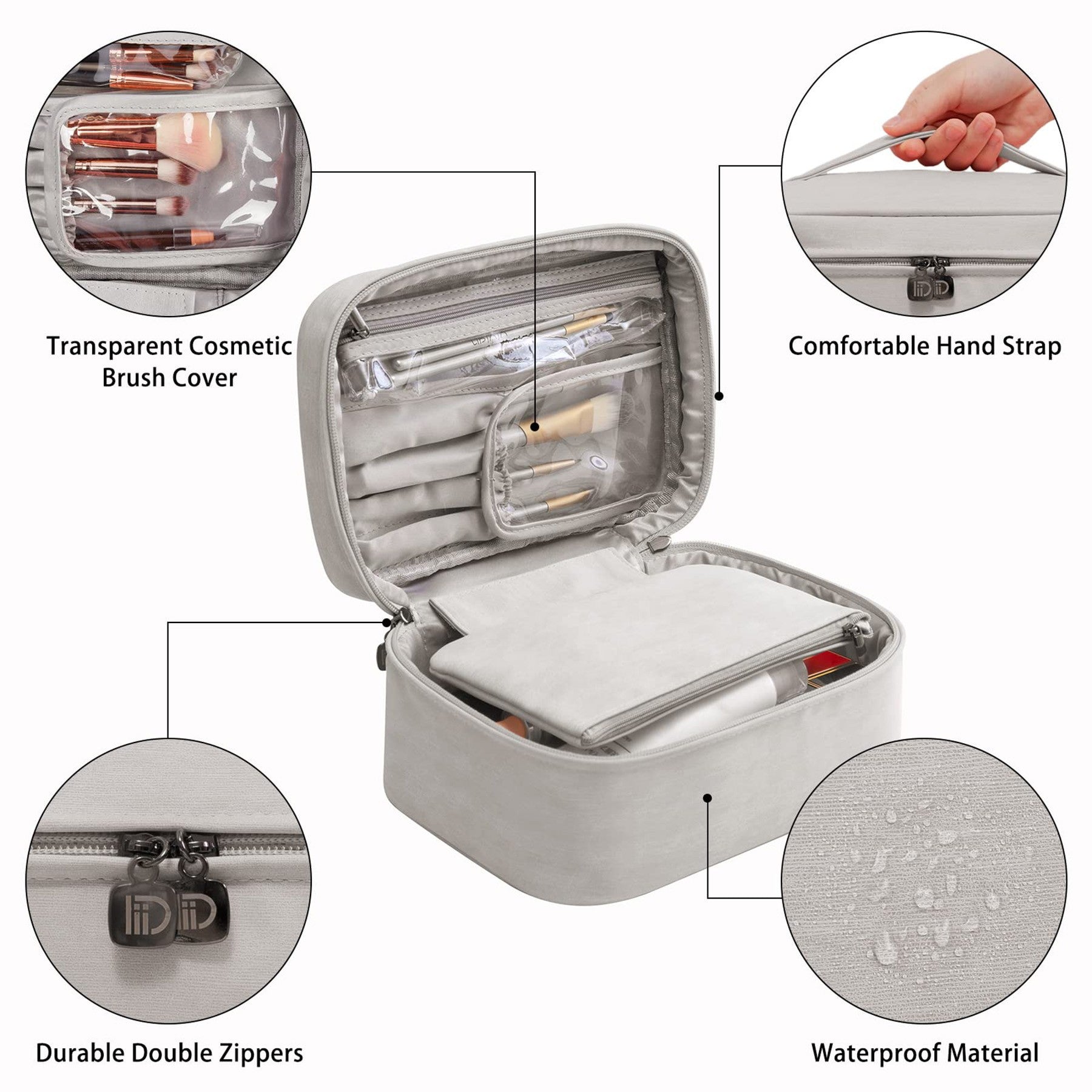 Made from PU leather with a nylon lining and stain-resistant finish. Customizable dividers help organize your cosmetics efficiently. Lightweight and durable with spill-proof interior. a full screen mirror for on-the-go touch-ups. 10.24′ L x 9.06′ W x 3.54′ H